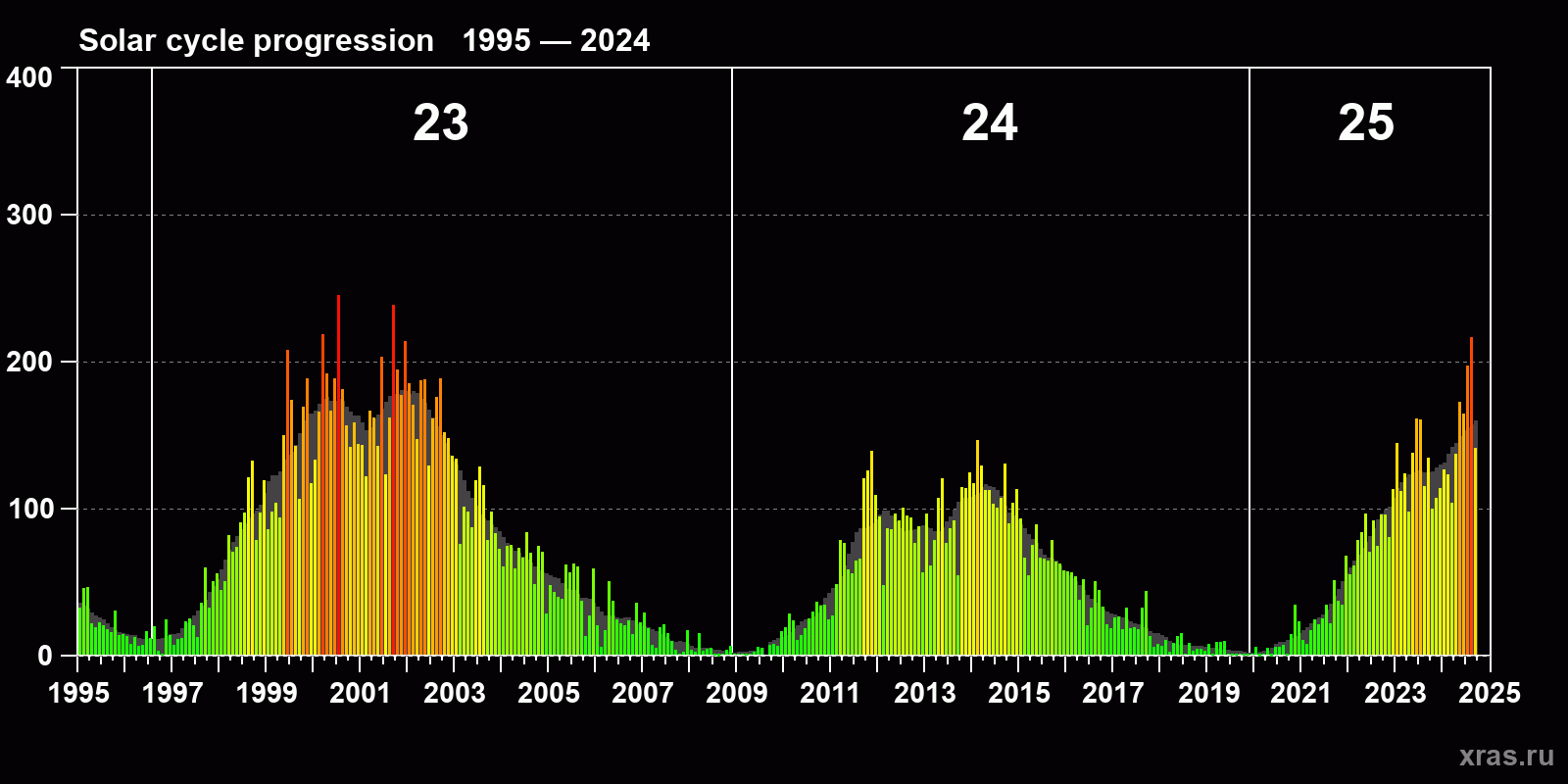 Average monthly sunspot number (SSN) from 1995, January to 2024, September. Gray background - average solar cycle.