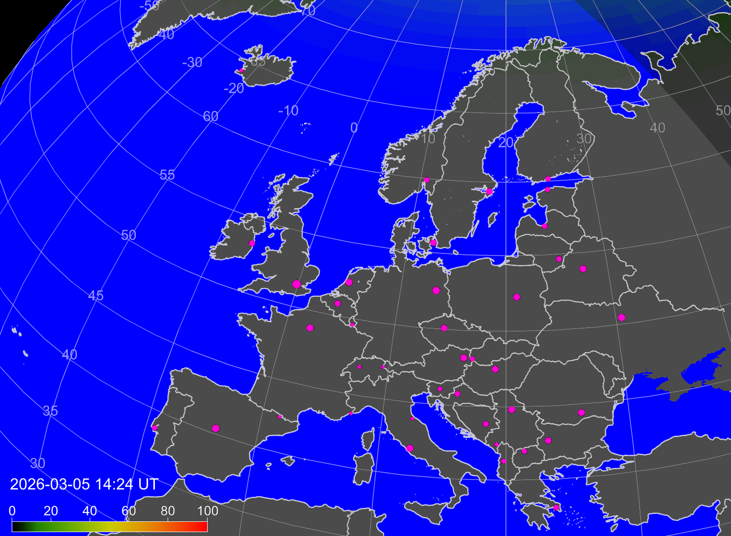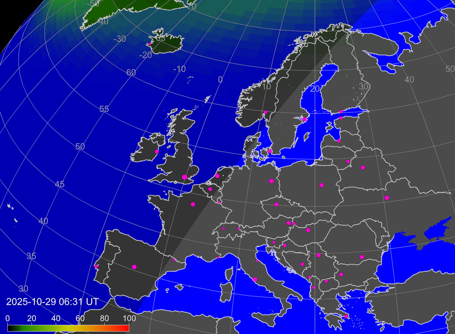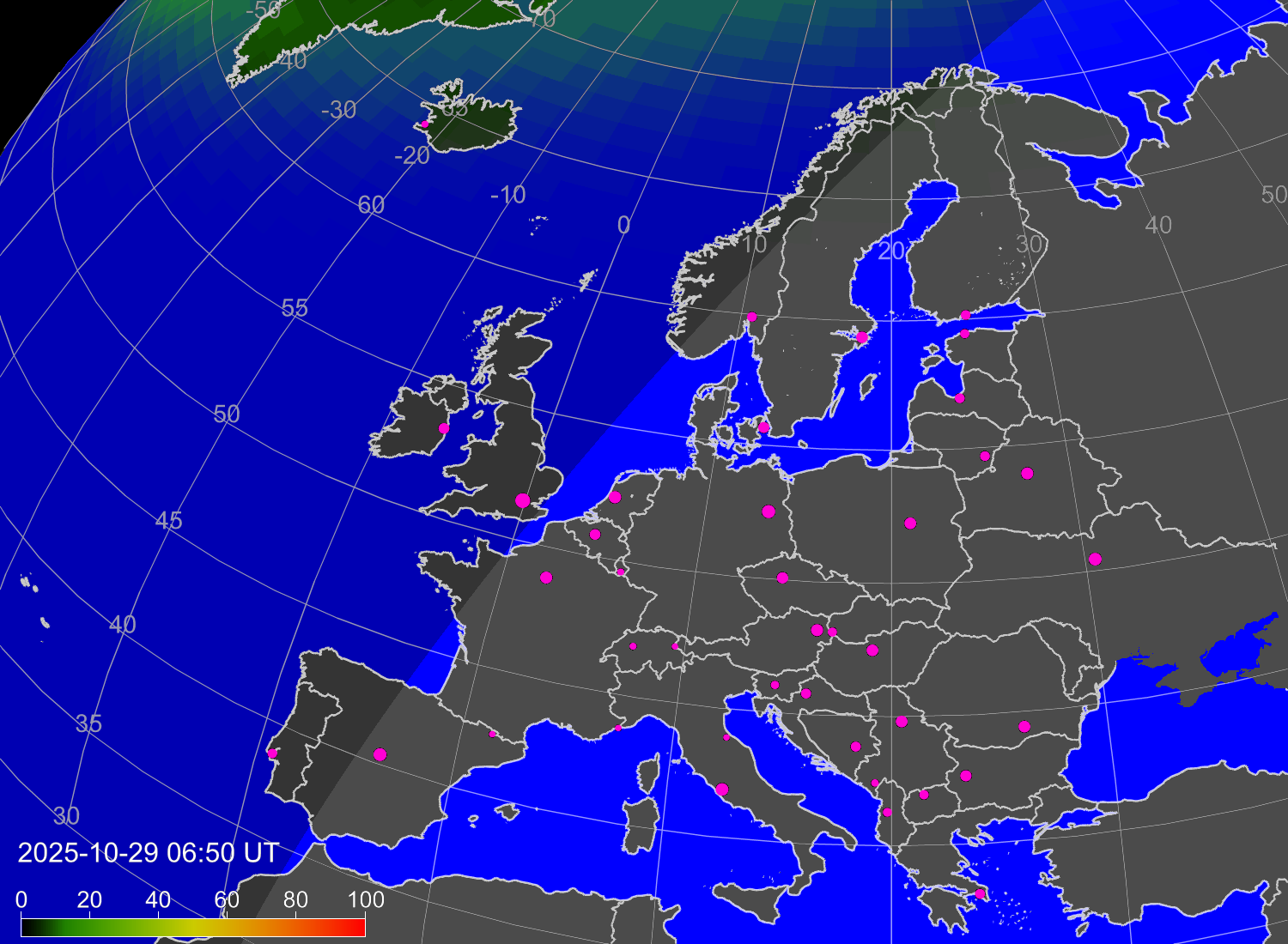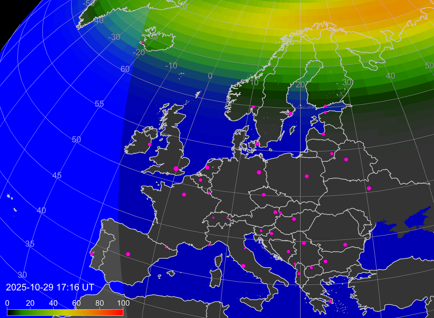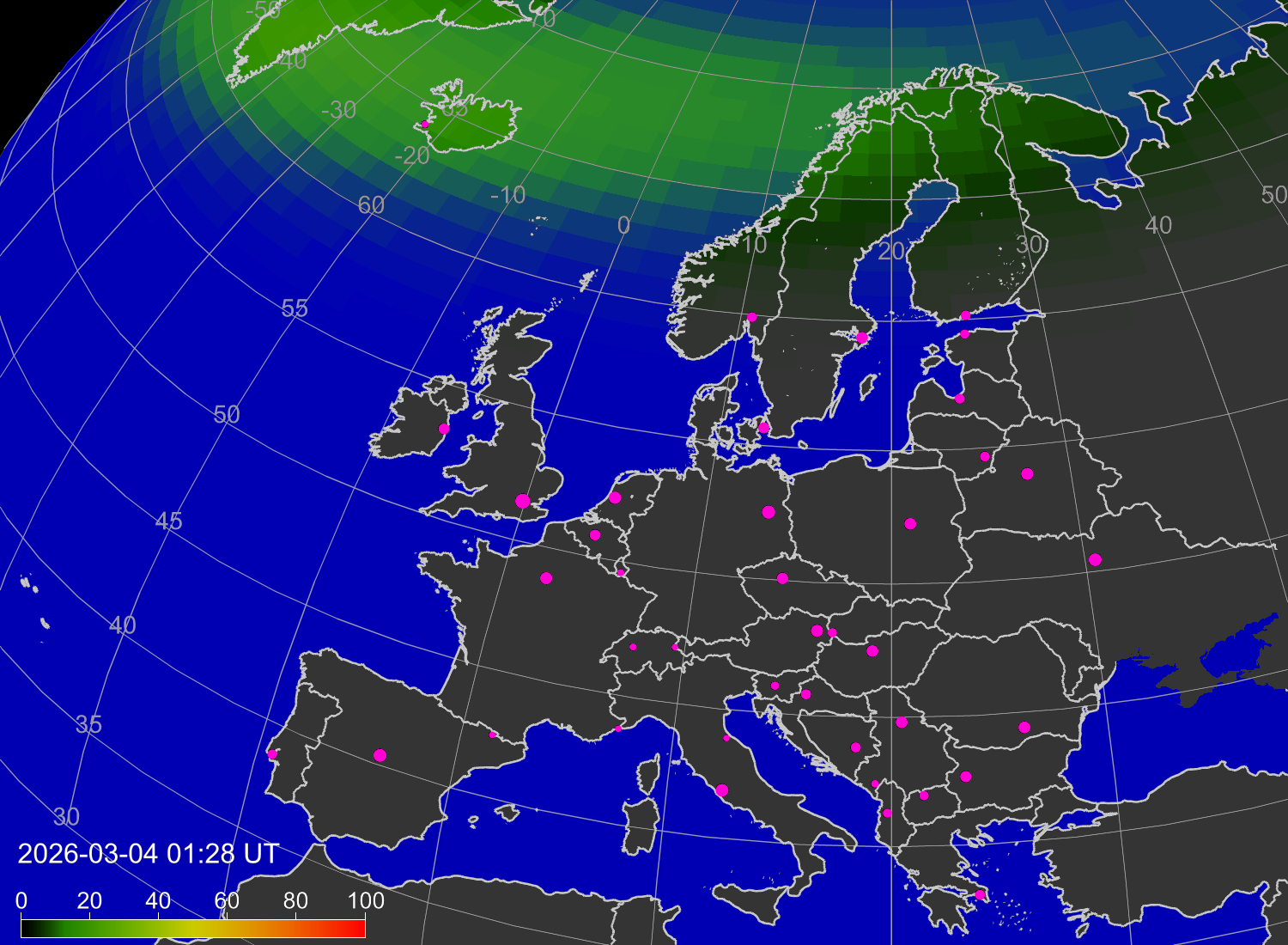 Probability of northern lights (auroras) in cities of Europe