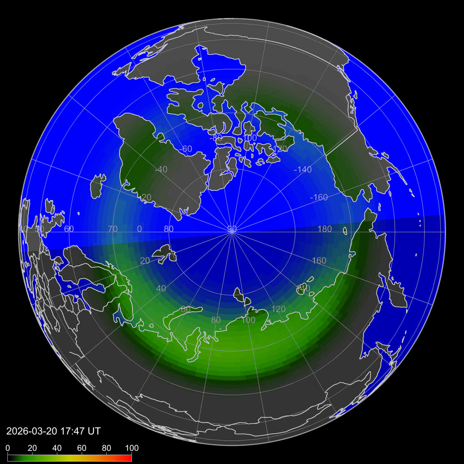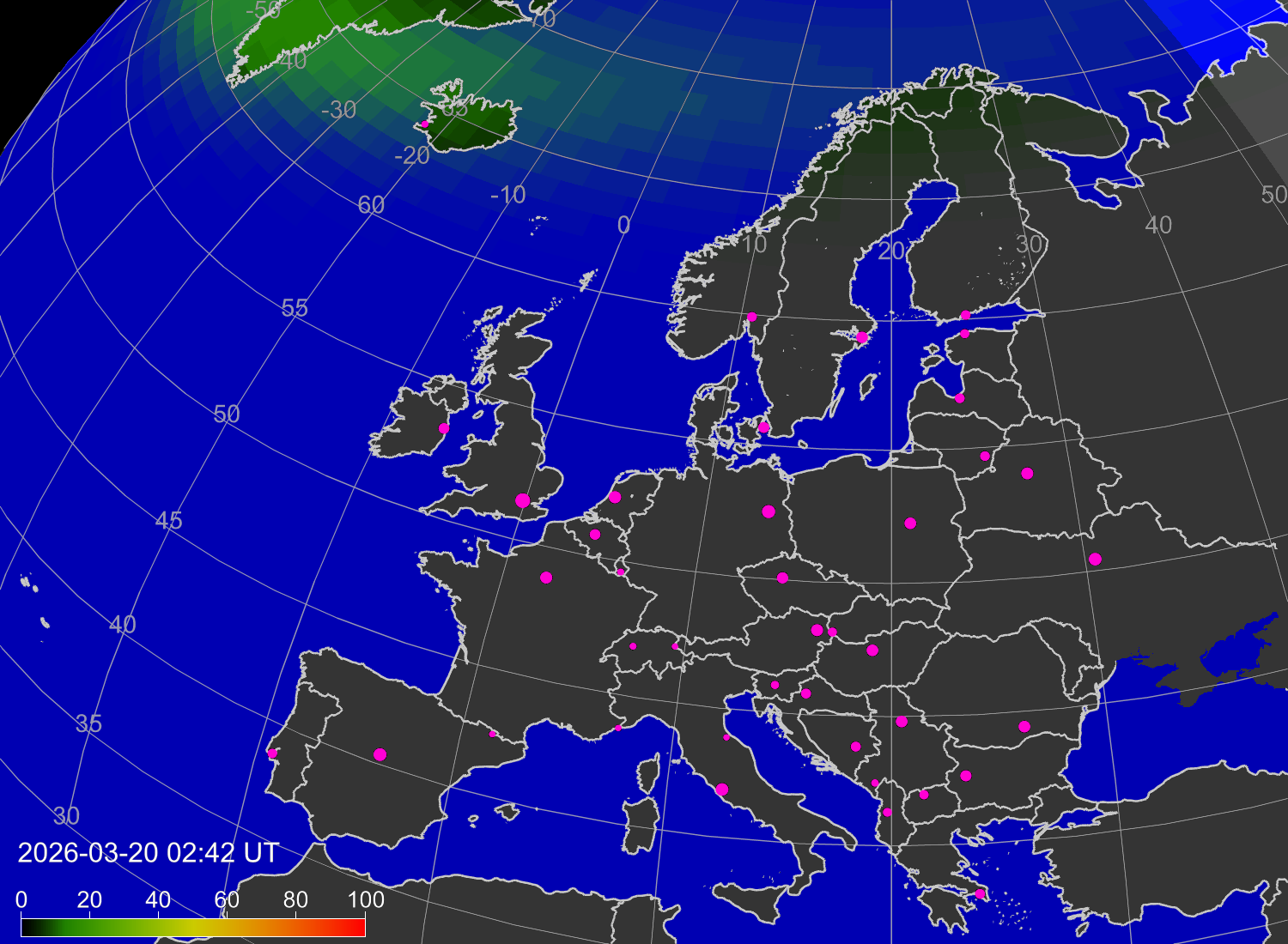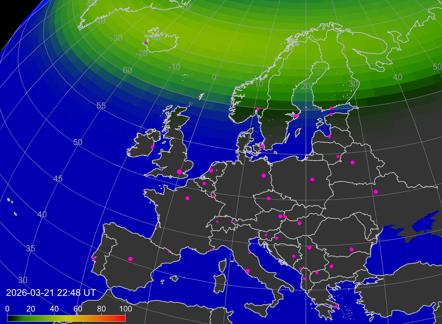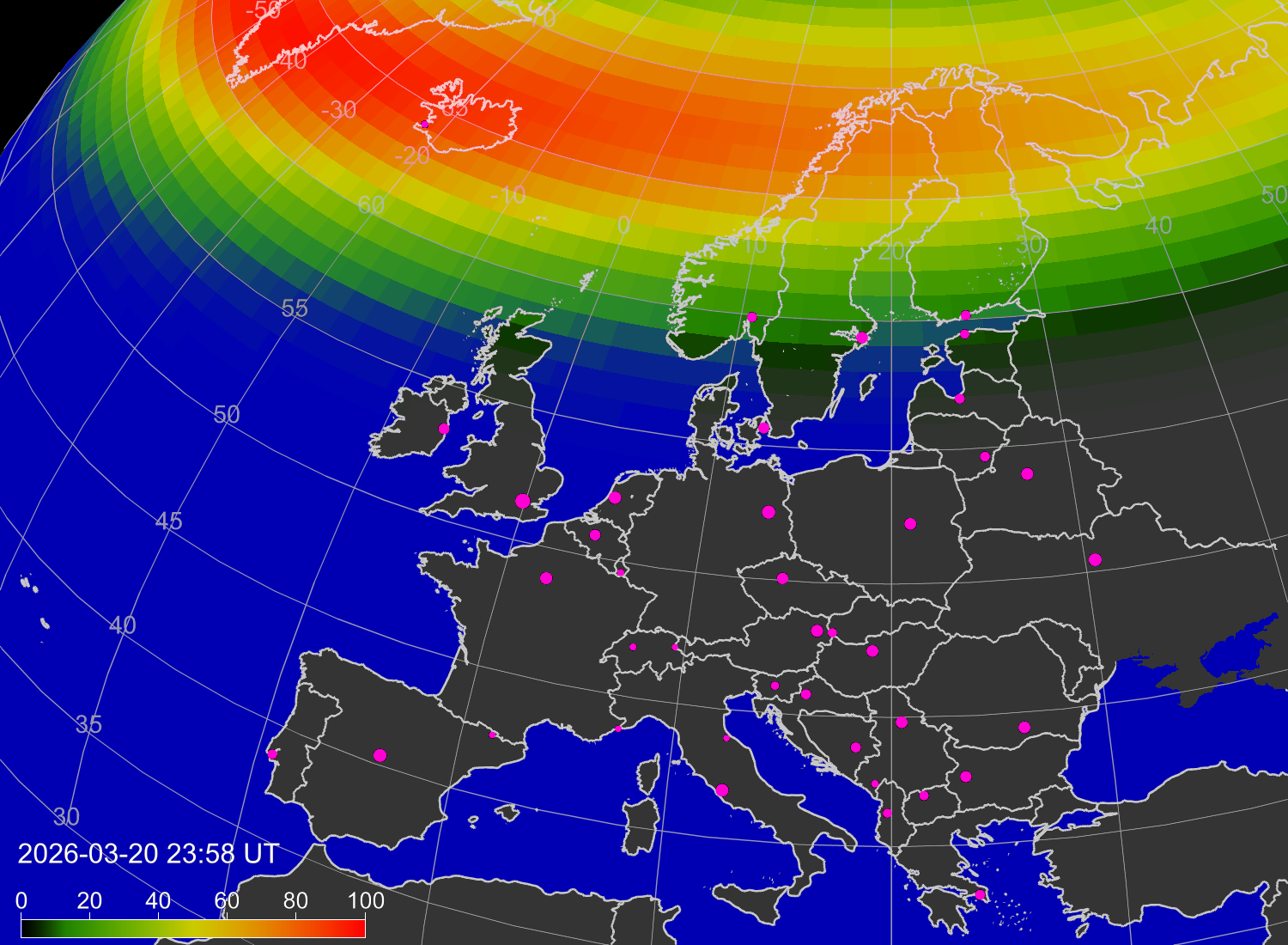 Auroral intensity index and theoretically possible latitude of observations for nighttime in the Estern Hemisphere