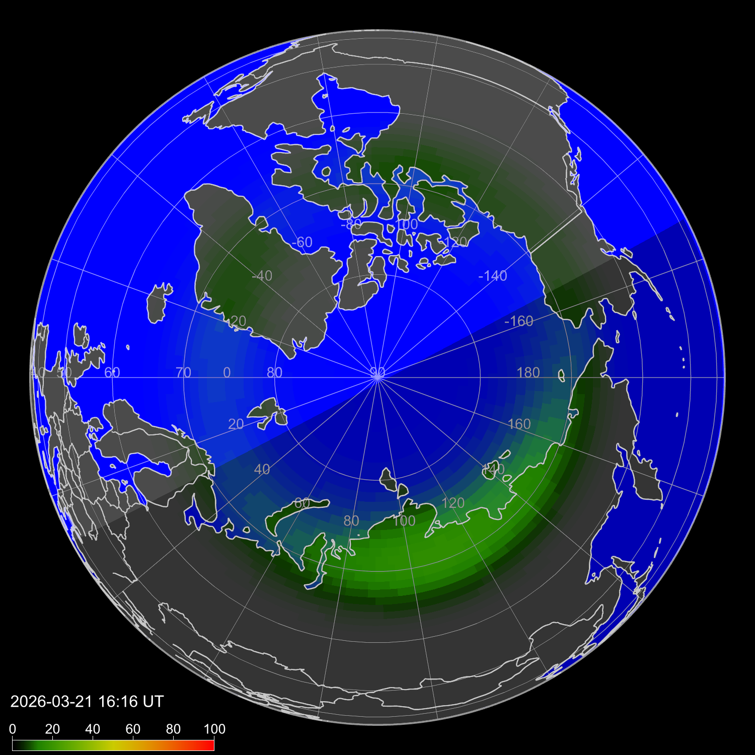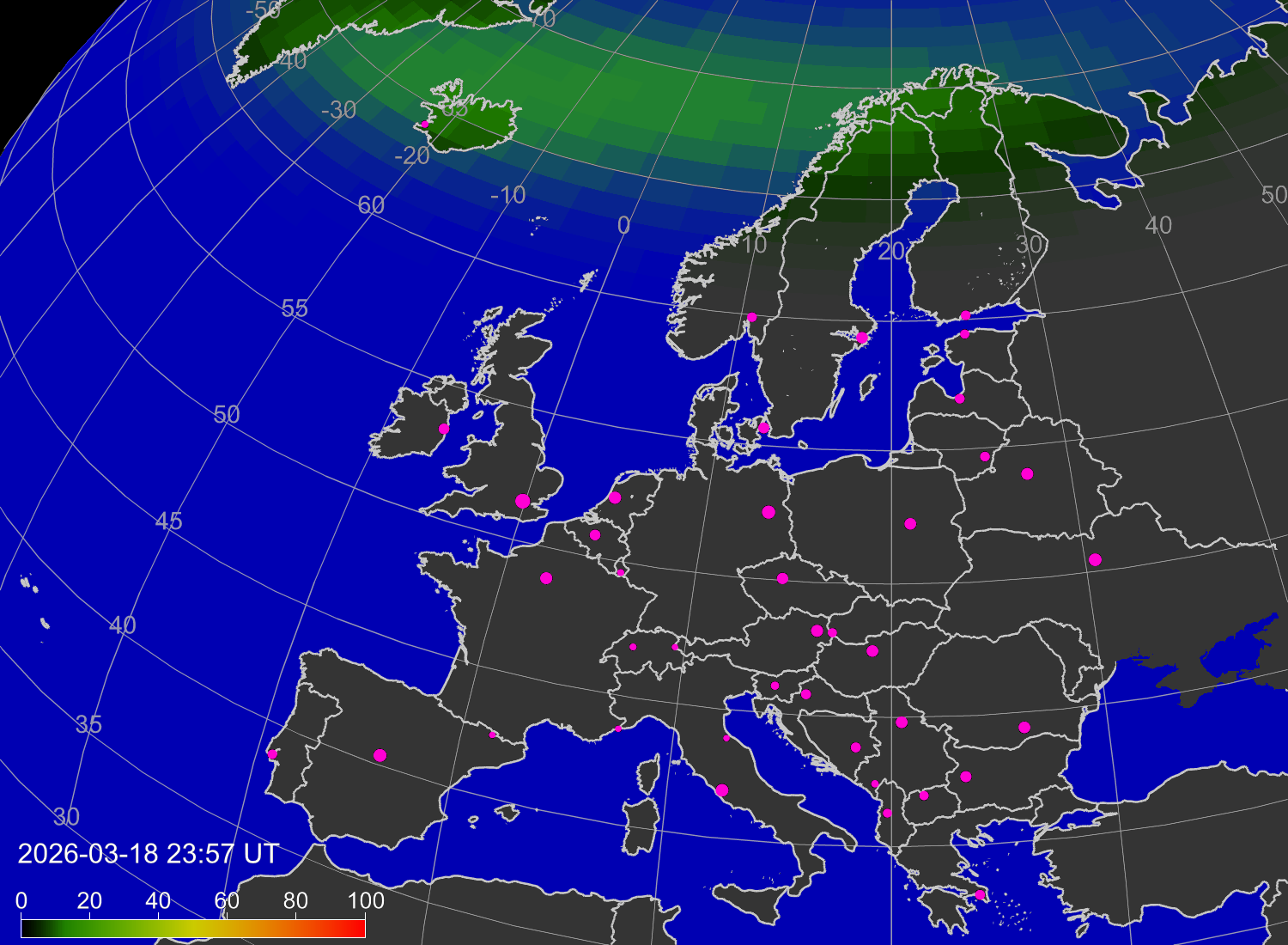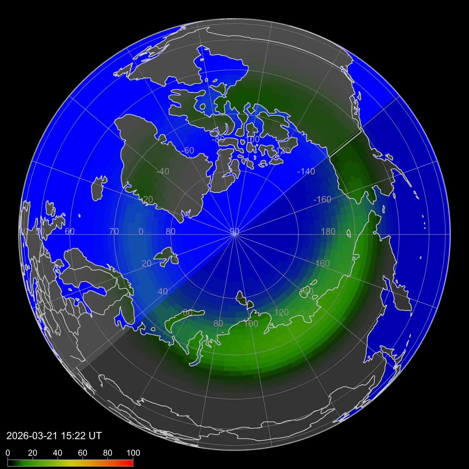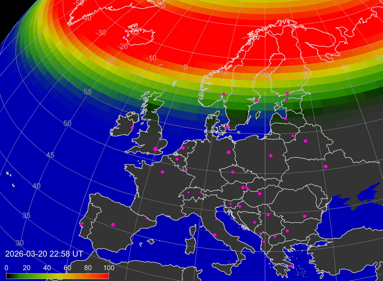 Auroral intensity index and theoretically possible latitude of observations for nighttime in the Estern Hemisphere