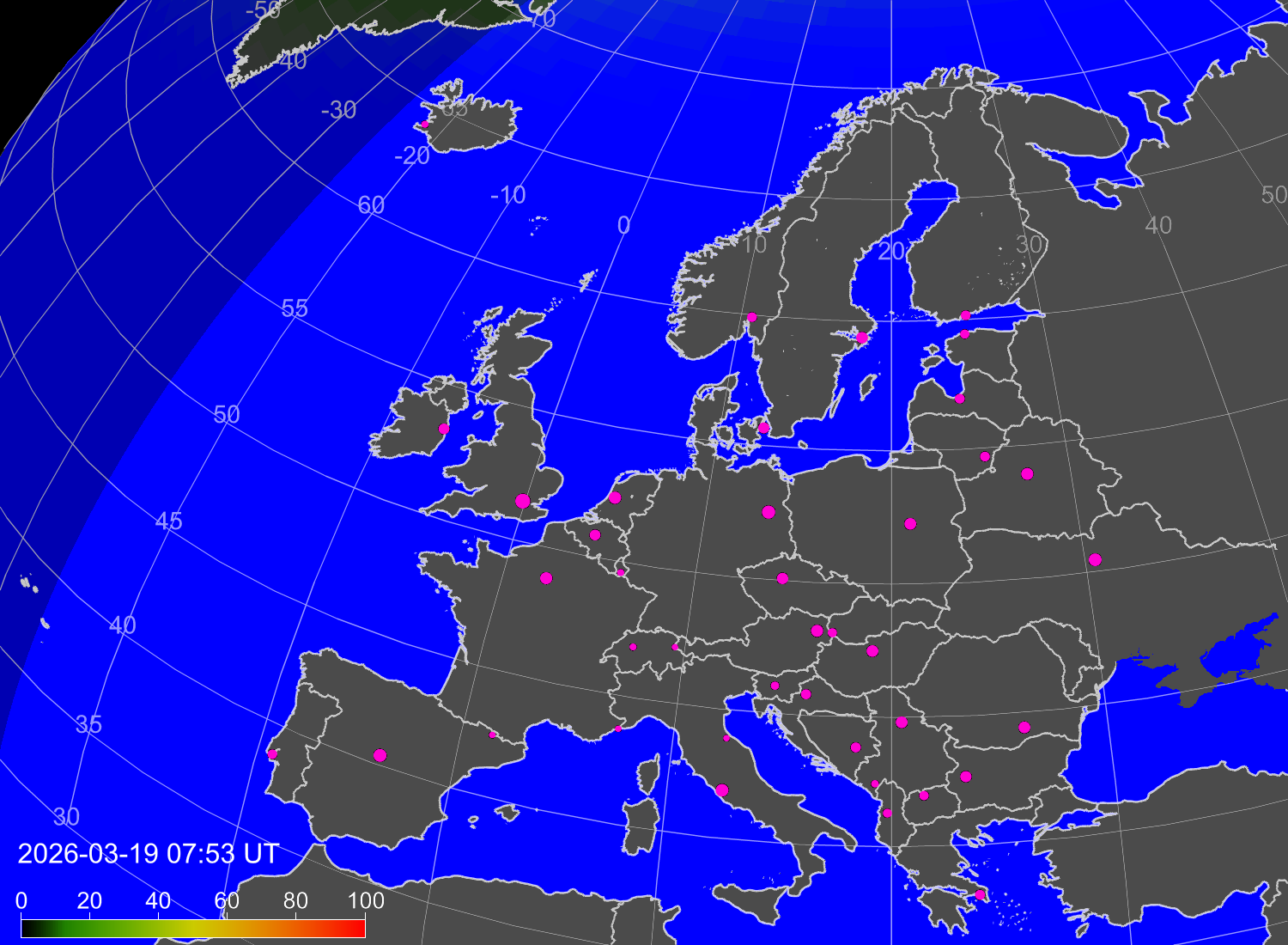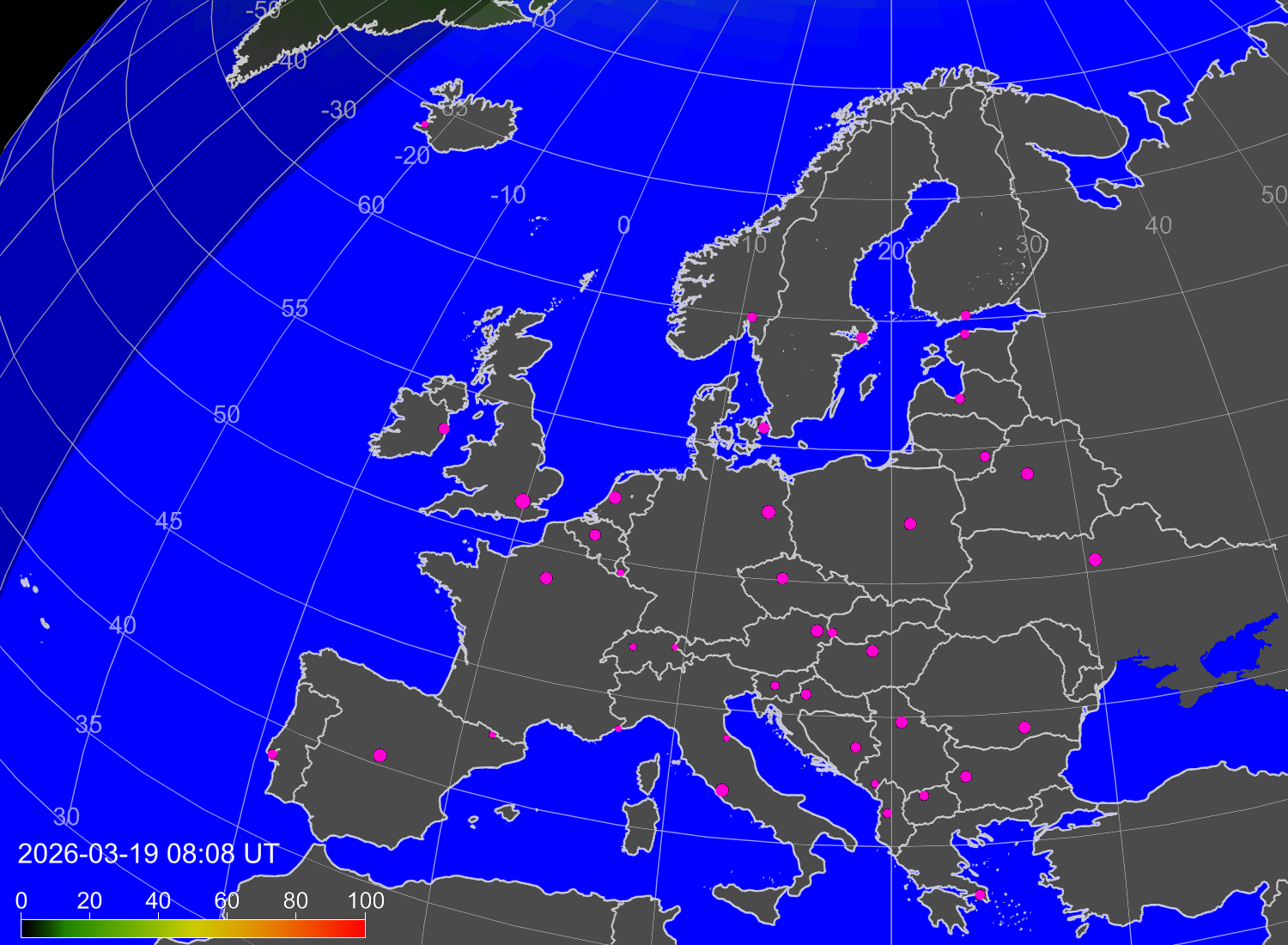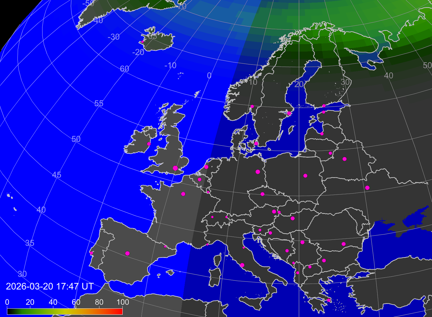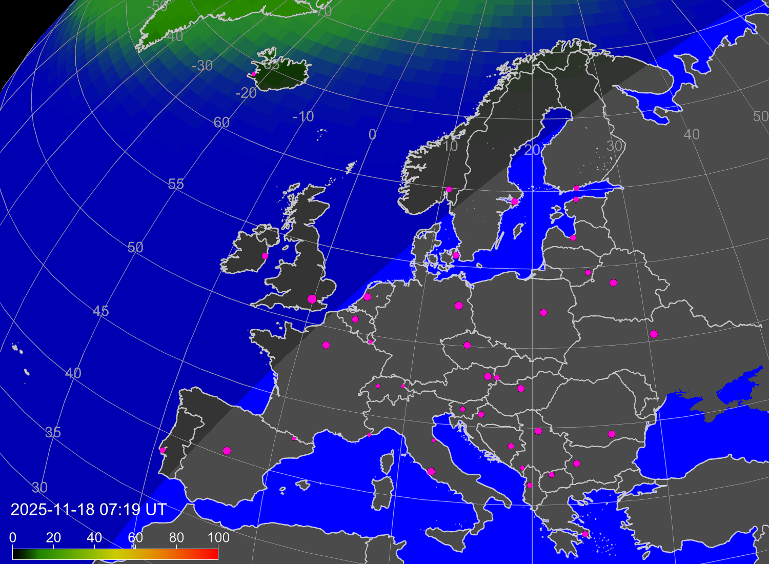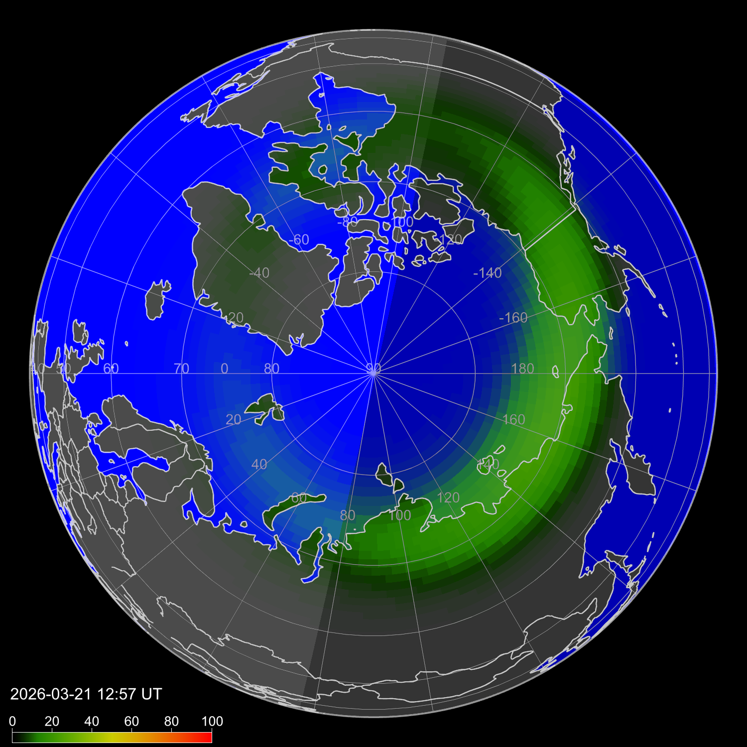Auroral intensity index and theoretically possible latitude of observations for nighttime in the Estern Hemisphere