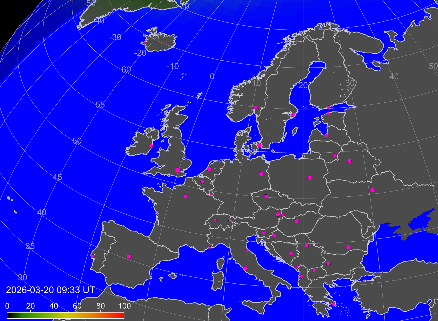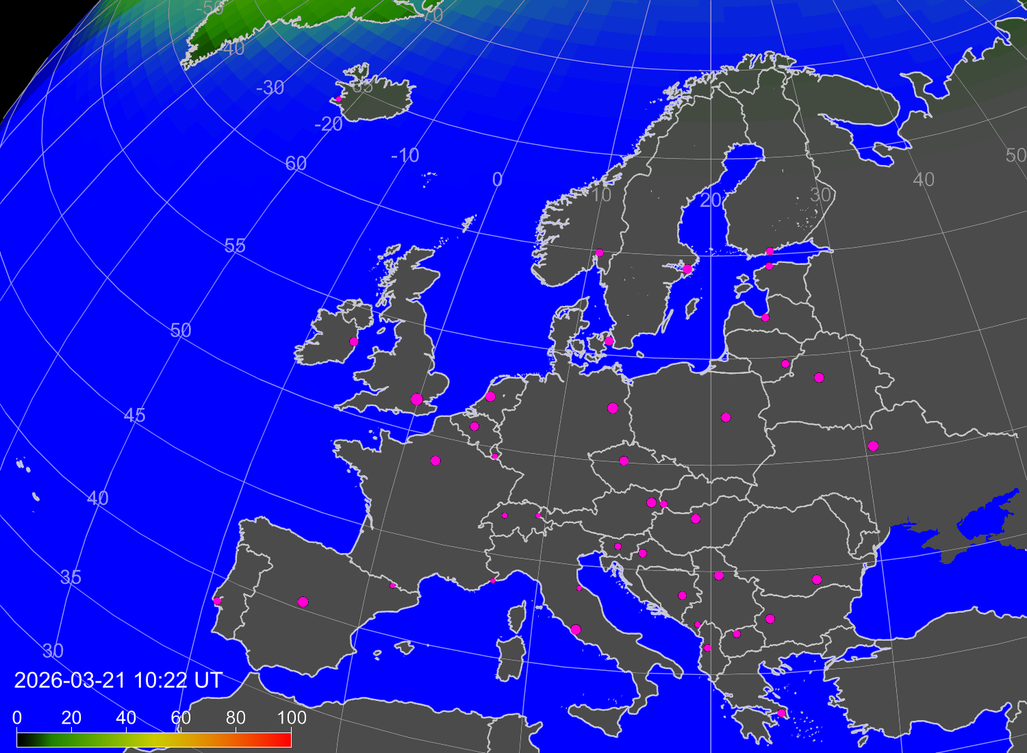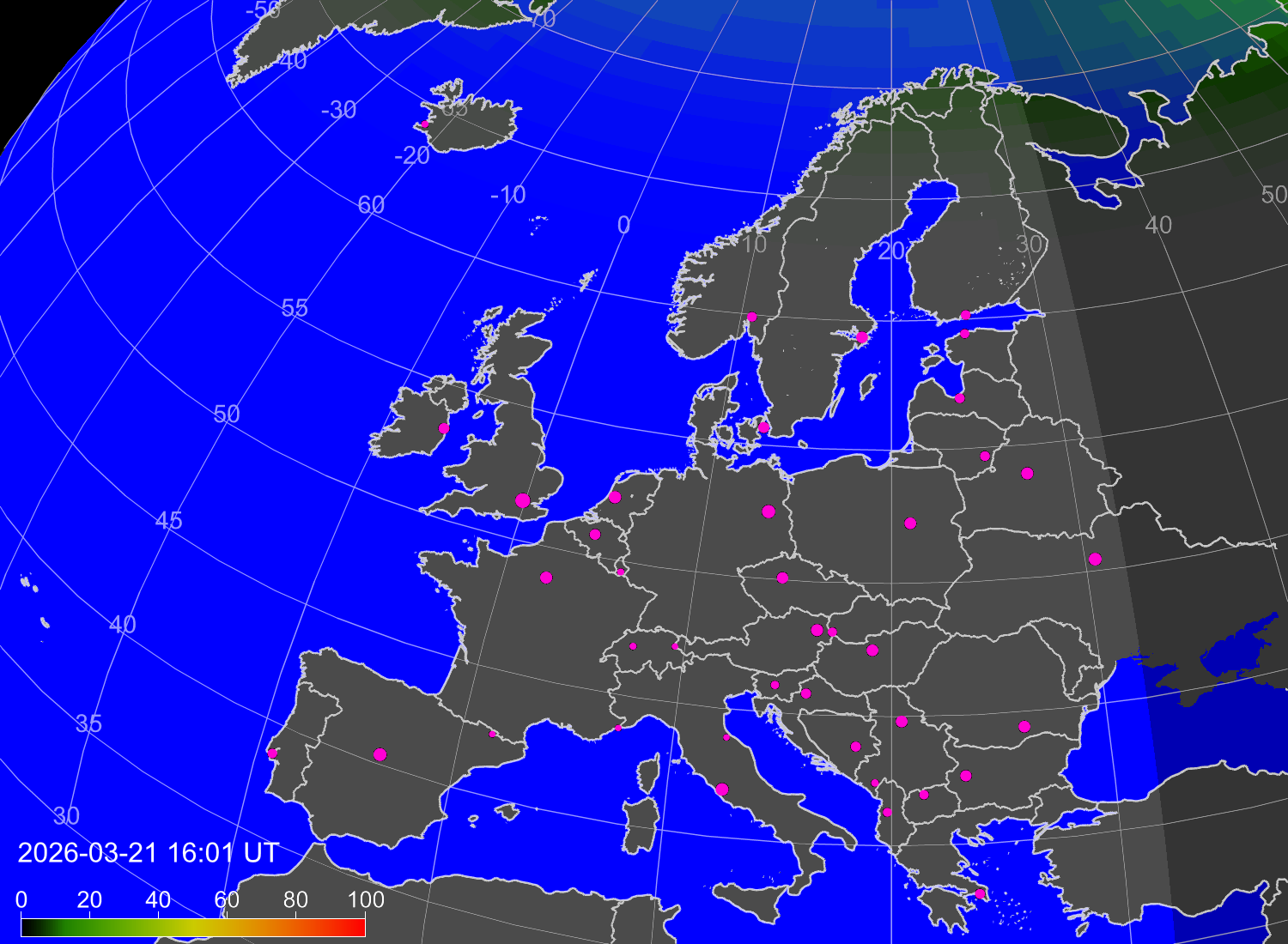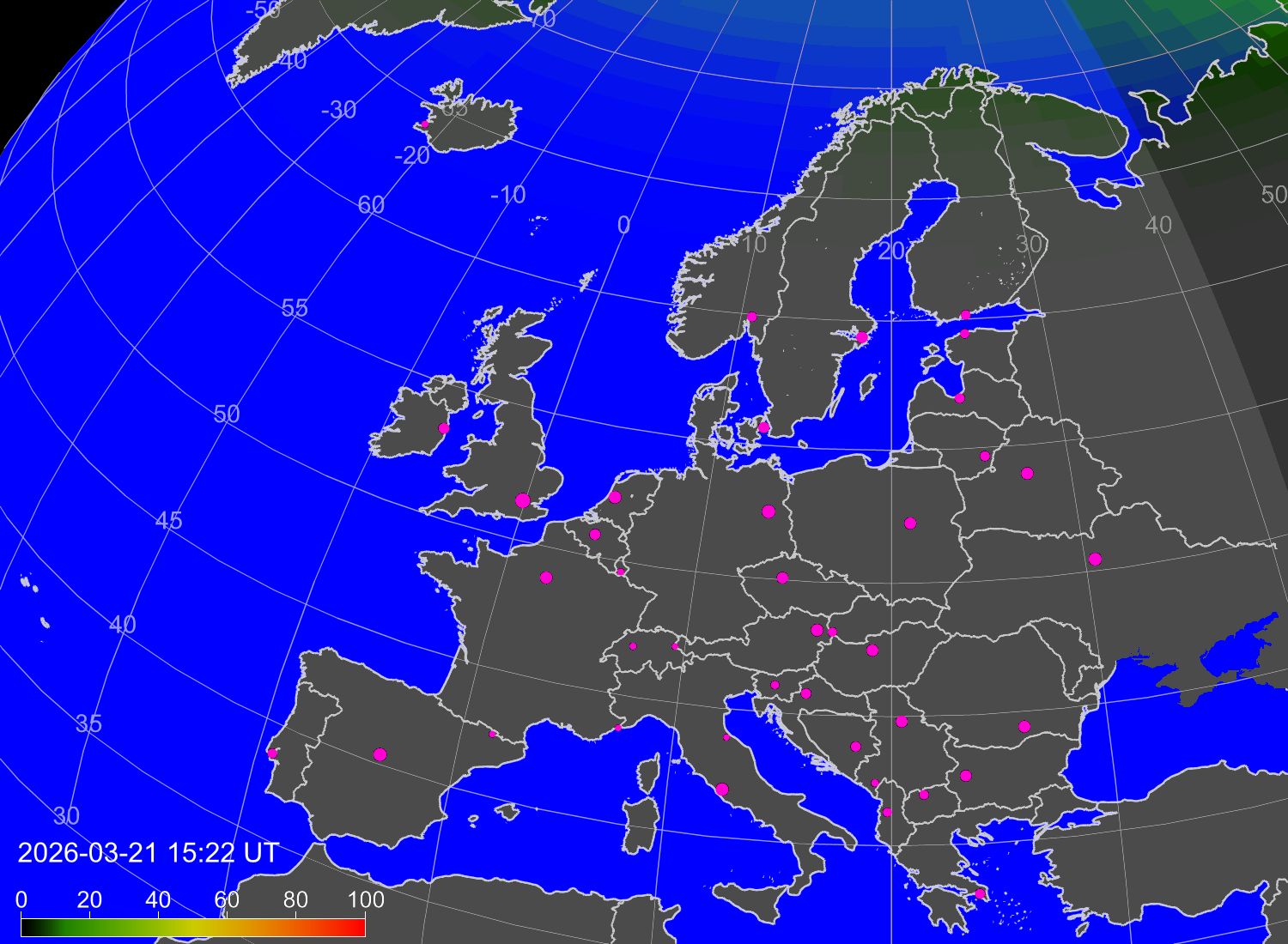 Auroral intensity index and theoretically possible latitude of observations for nighttime in the Estern Hemisphere