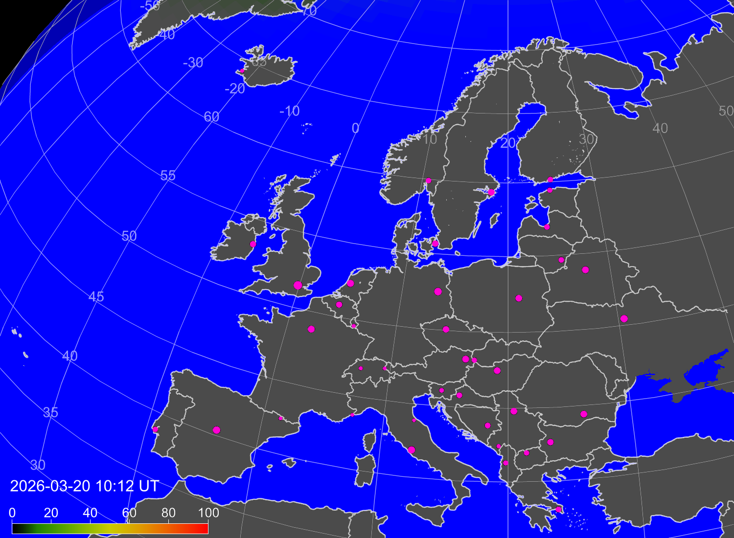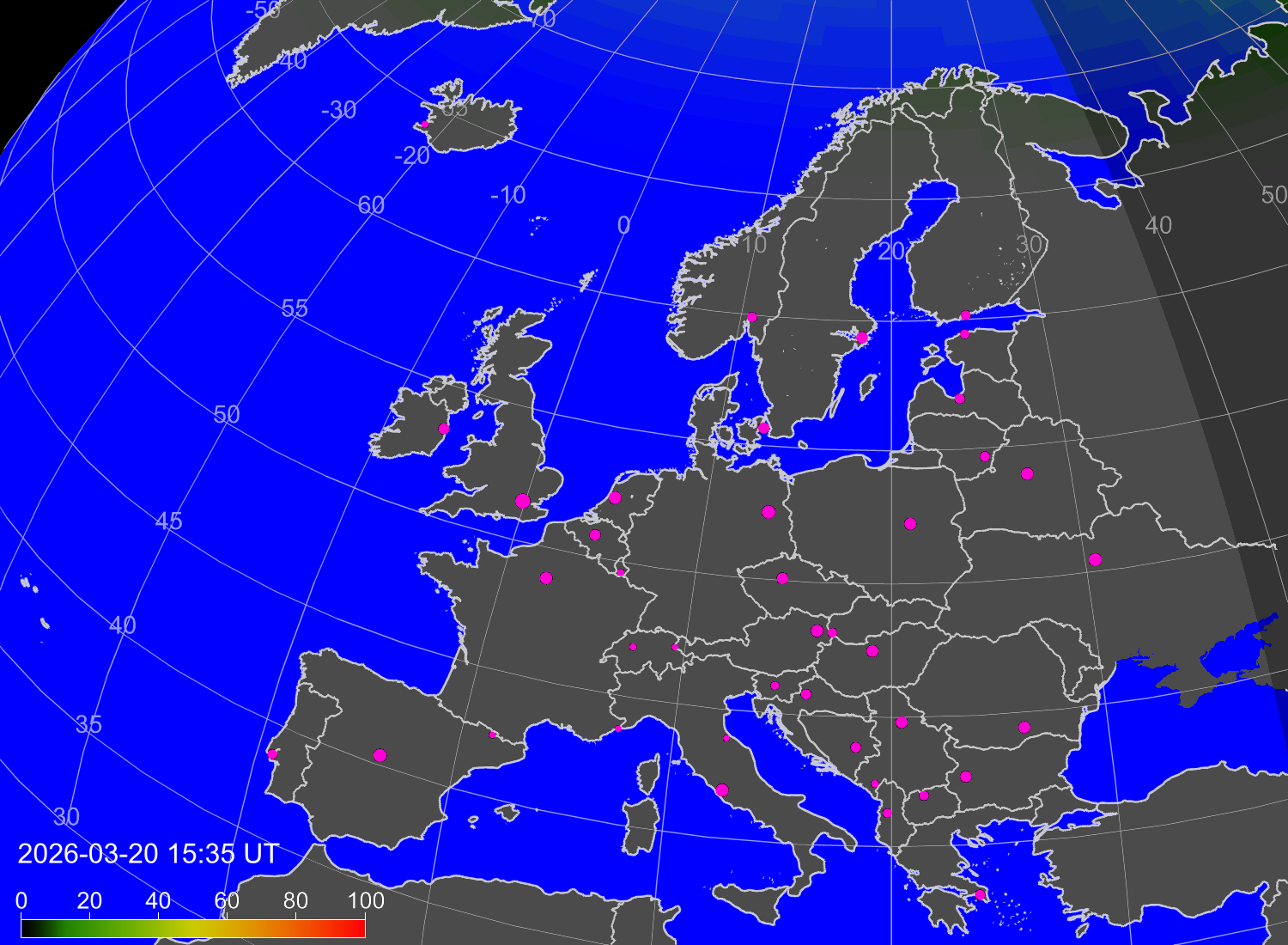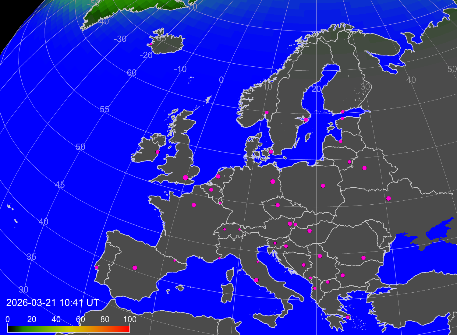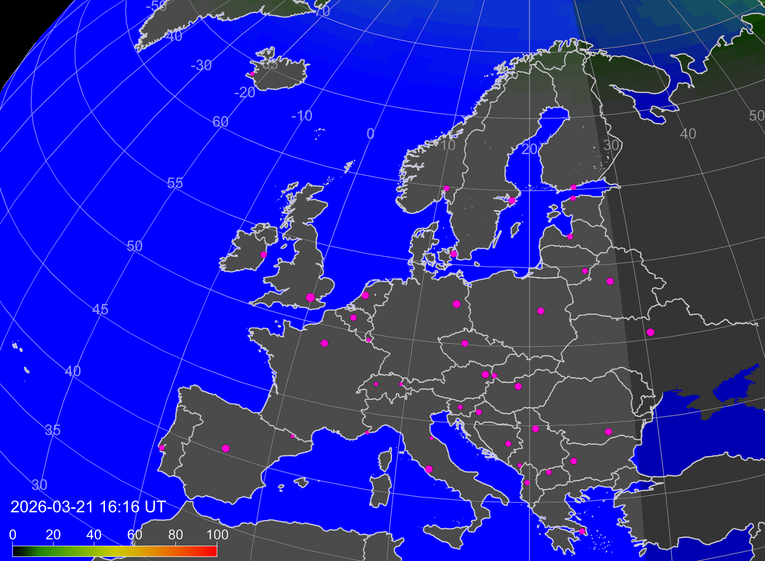 Auroral intensity index and theoretically possible latitude of observations for nighttime in the Estern Hemisphere