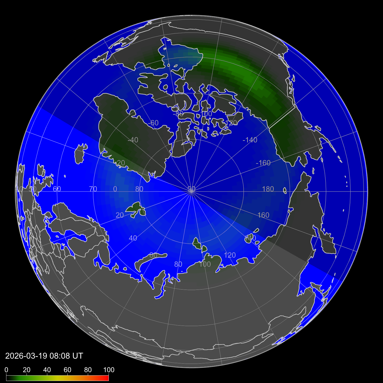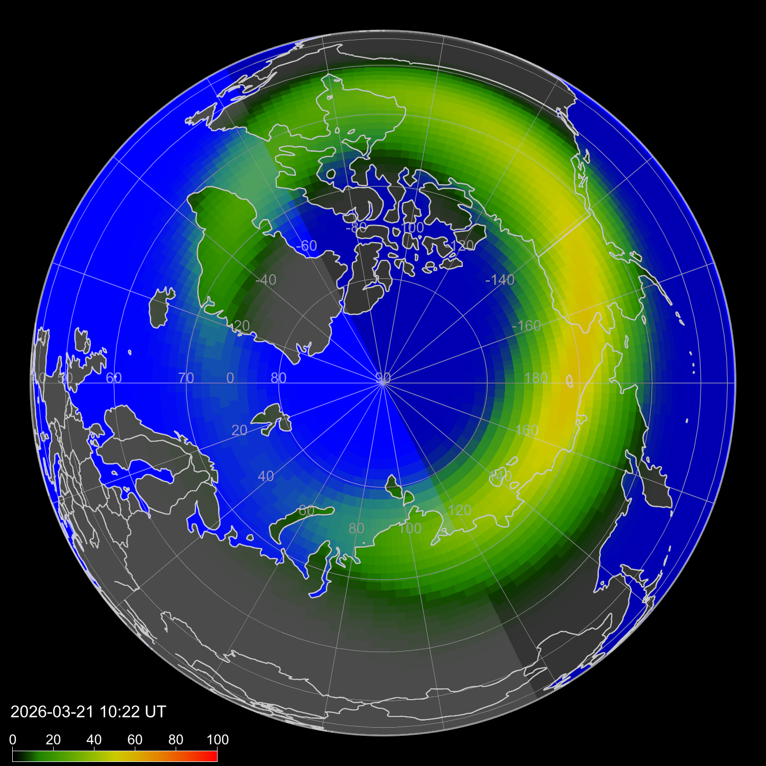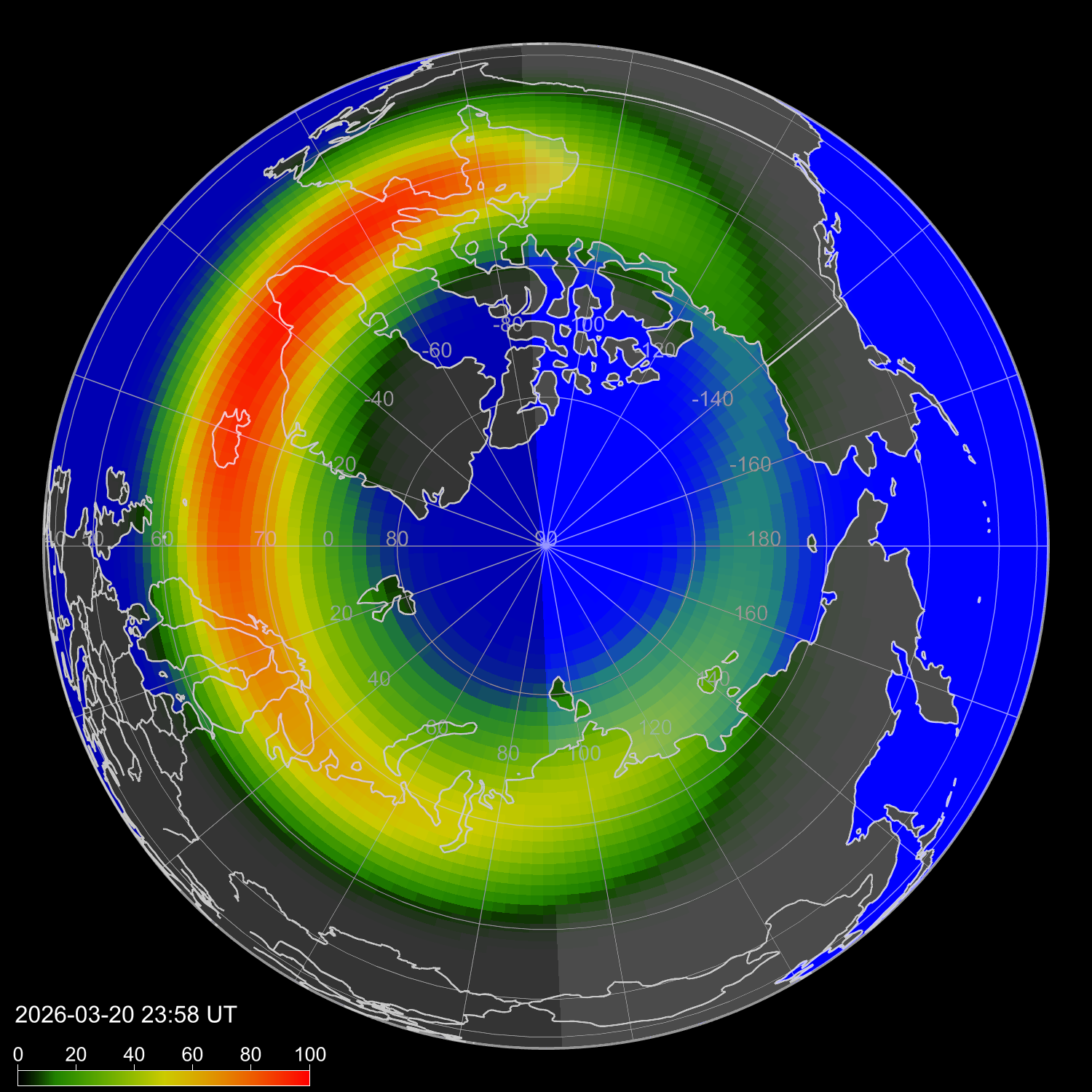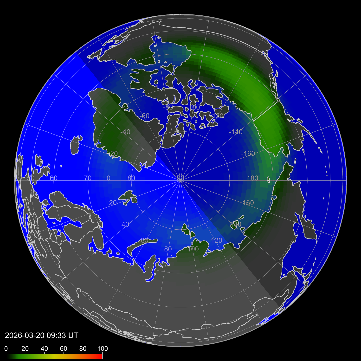 Changes and hourly forecast of the auroral intensity index from 2026-03-19 to 2026-03-20