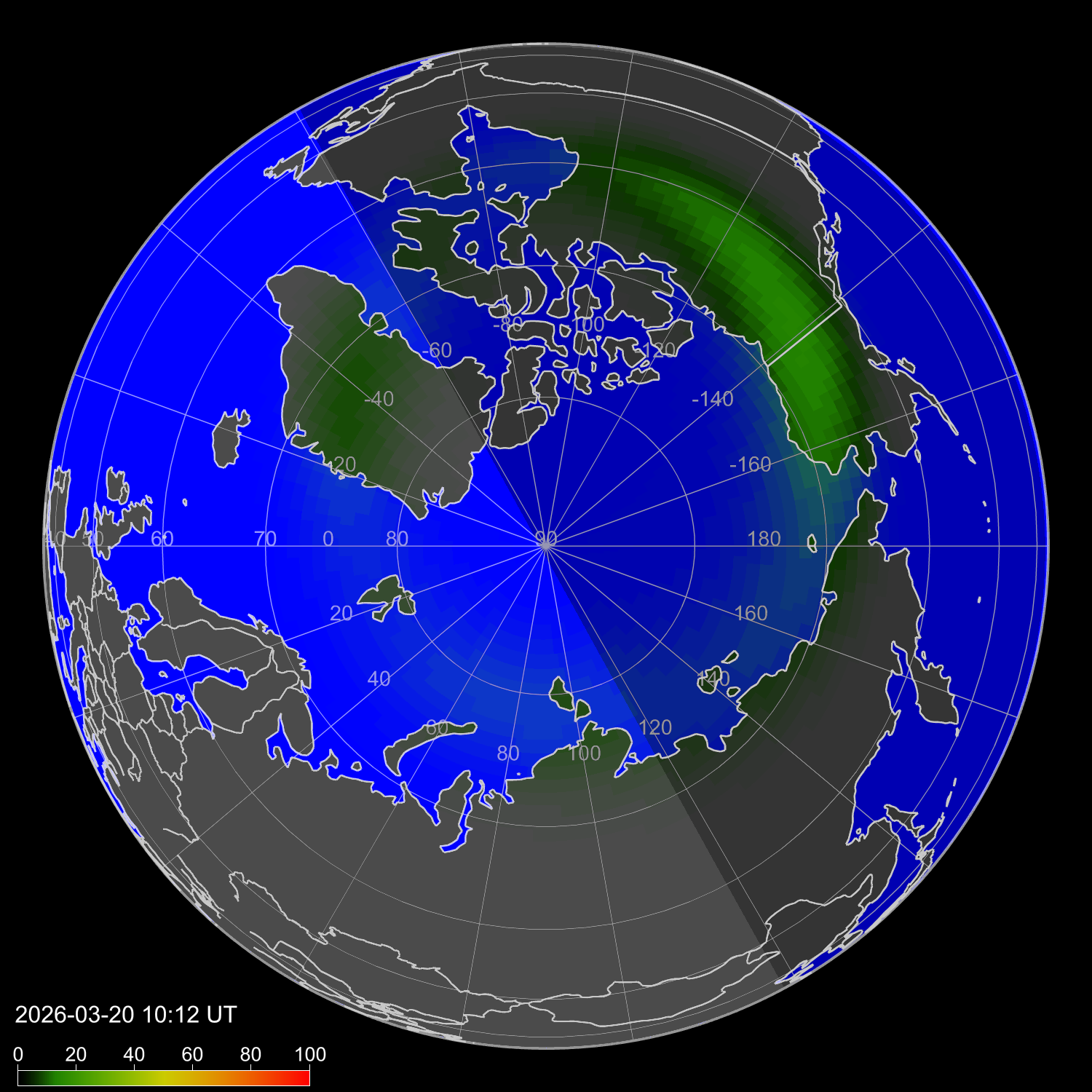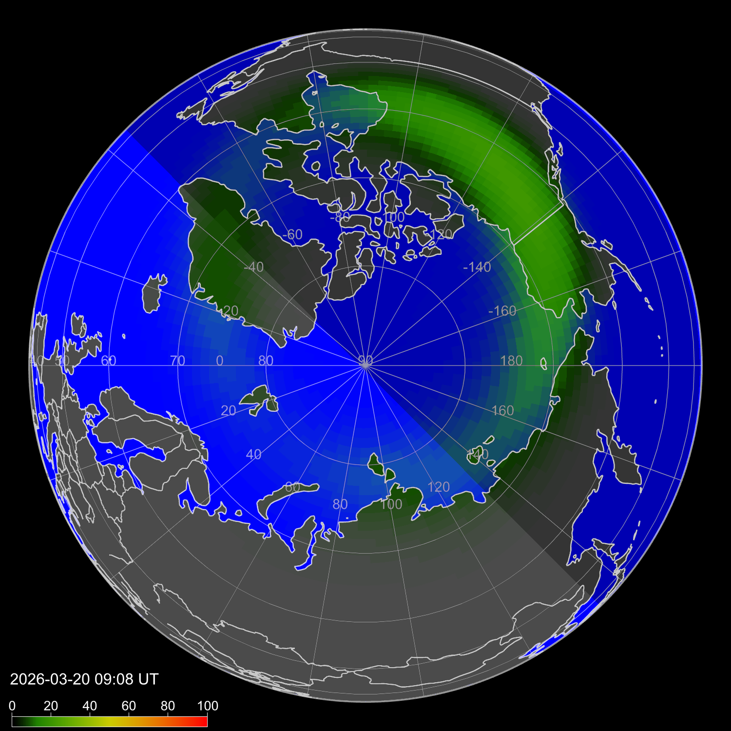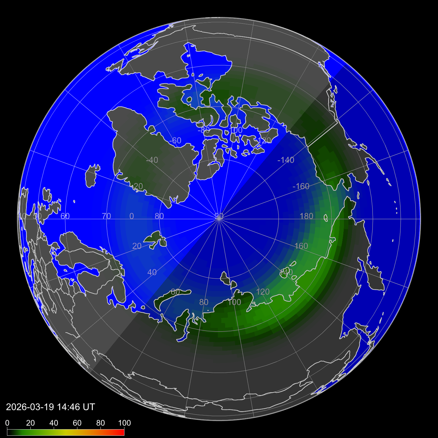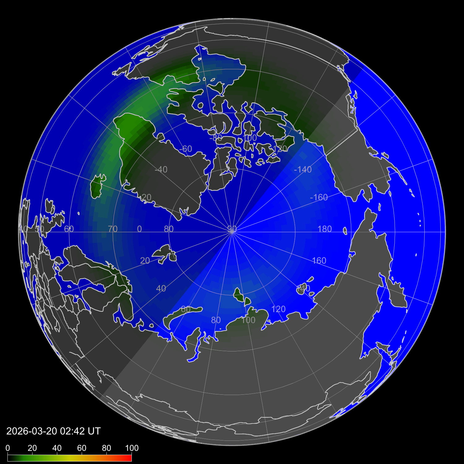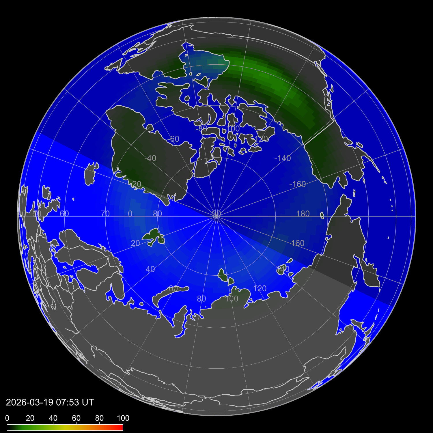 Changes and hourly forecast of the auroral intensity index from 2026-03-19 to 2026-03-20