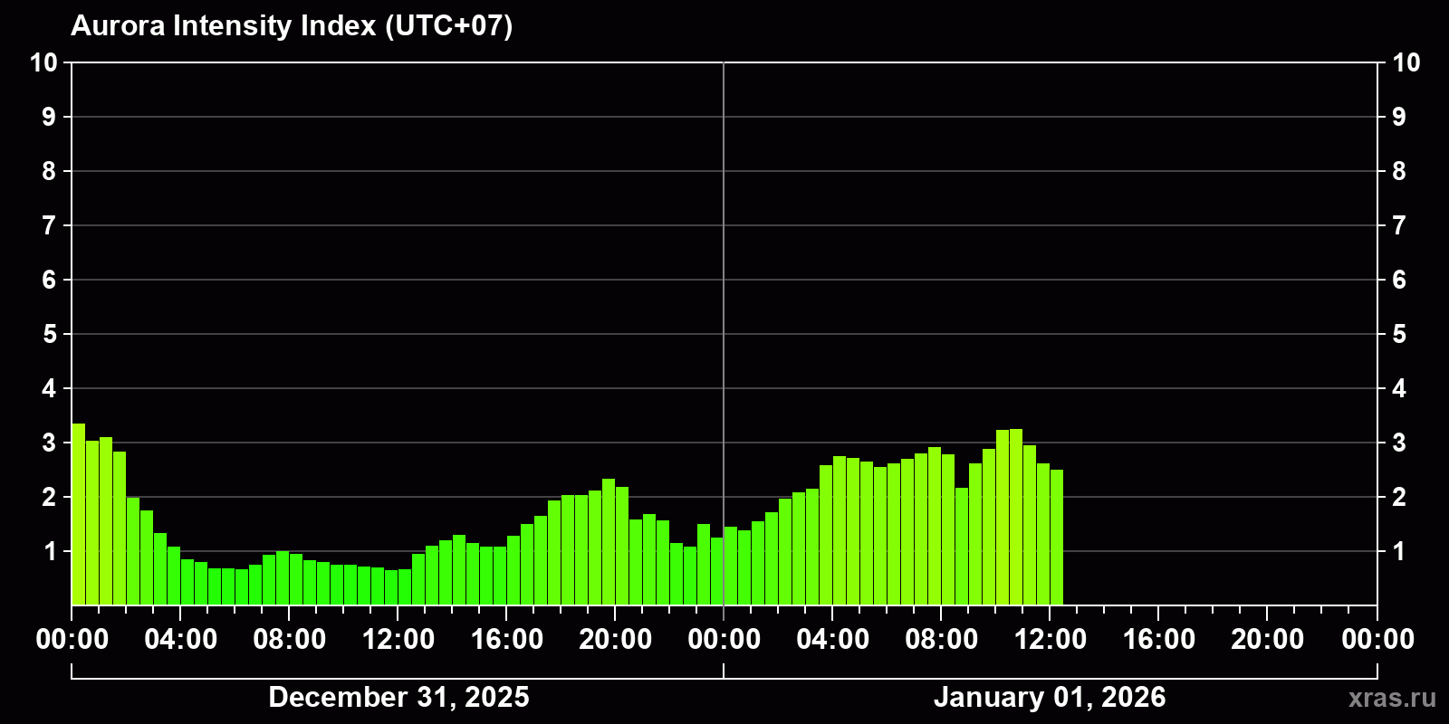 Auroral intensity index and the theoretically possible latitude of observations for nighttime in the Estern Hemisphere as of 2026-01-01 08:44 (end of day) local time