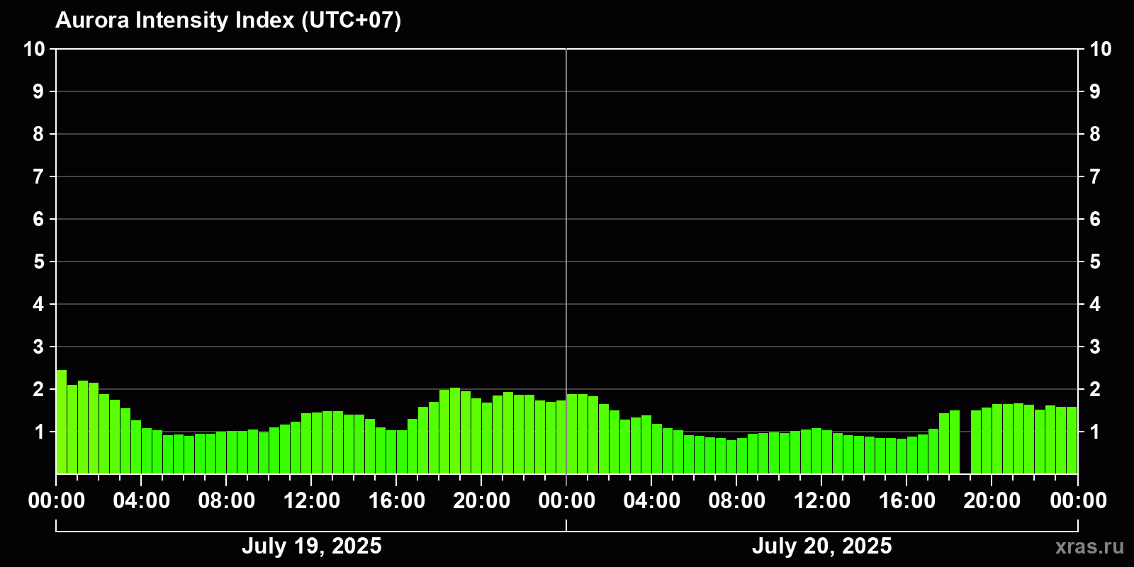 Changes in the auroral intensity index from 2025-07-19 to 2025-07-20 local time