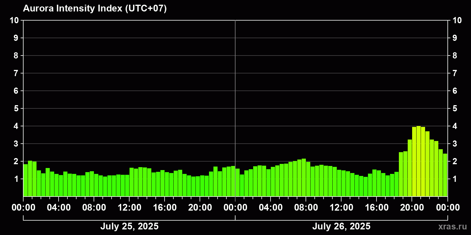 Changes in the auroral intensity index from 2025-07-25 to 2025-07-26 local time