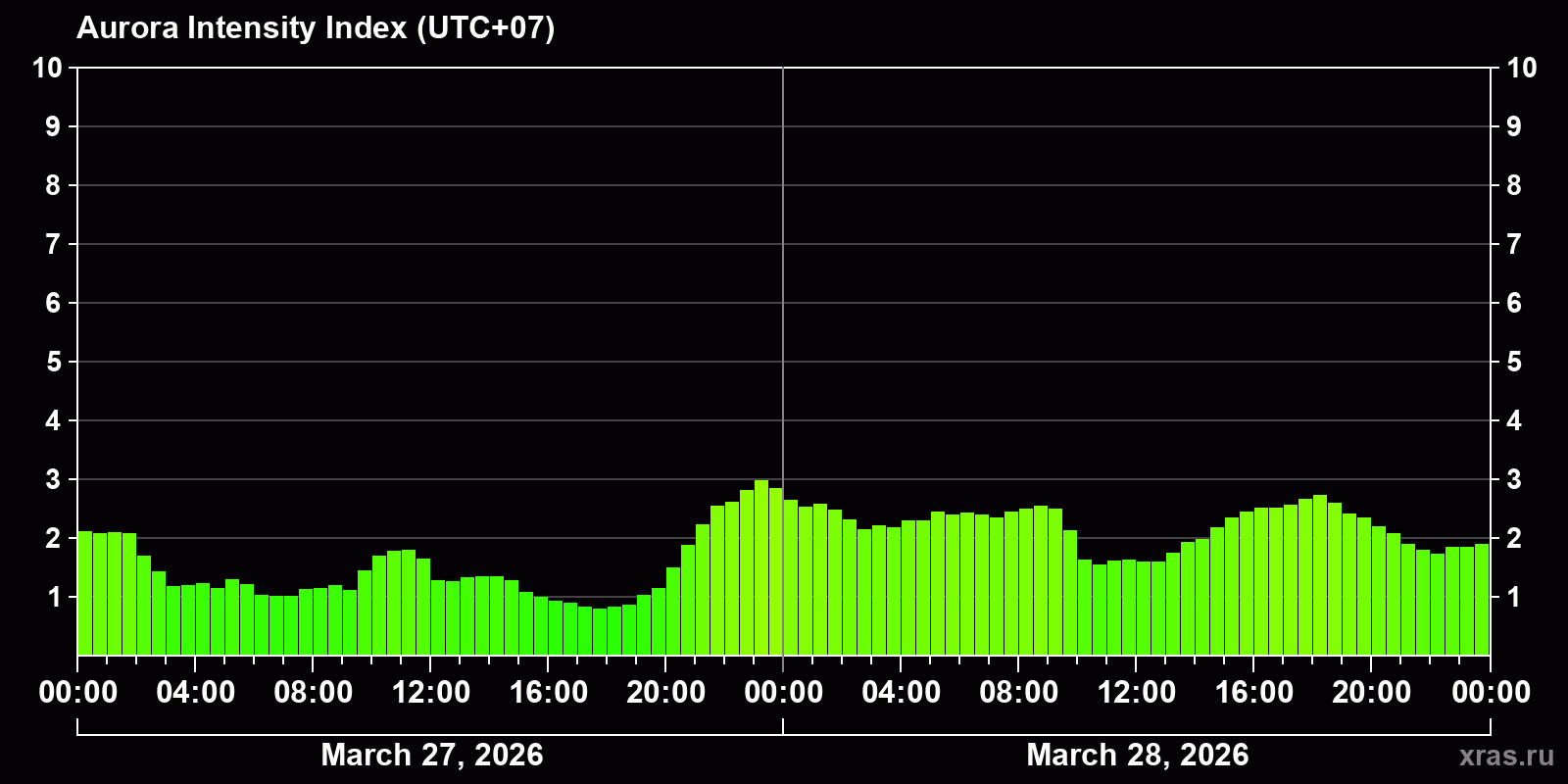 Changes in the auroral intensity index from 2026-03-27 to 2026-03-28 local time
