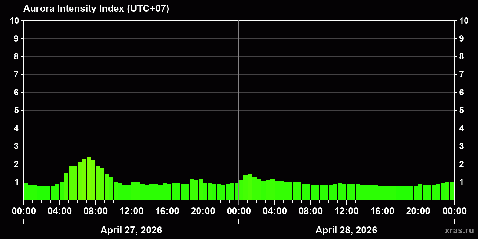 Auroral intensity index and the theoretically possible latitude of observations for nighttime in the Estern Hemisphere as of 2026-04-28 23:48 (end of day) local time