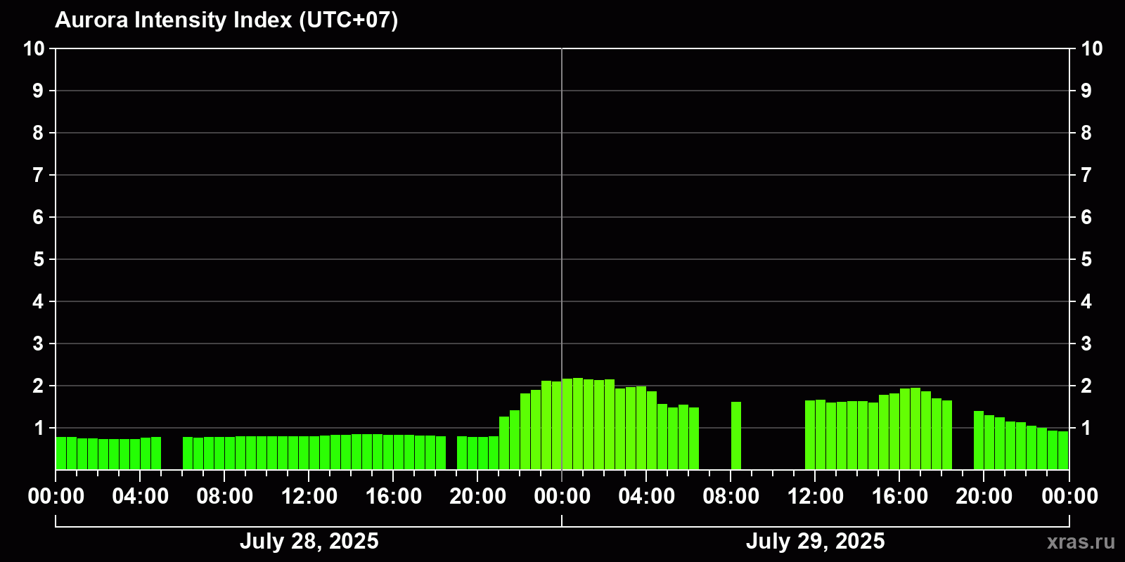 Changes in the auroral intensity index from 2025-07-28 to 2025-07-29 local time