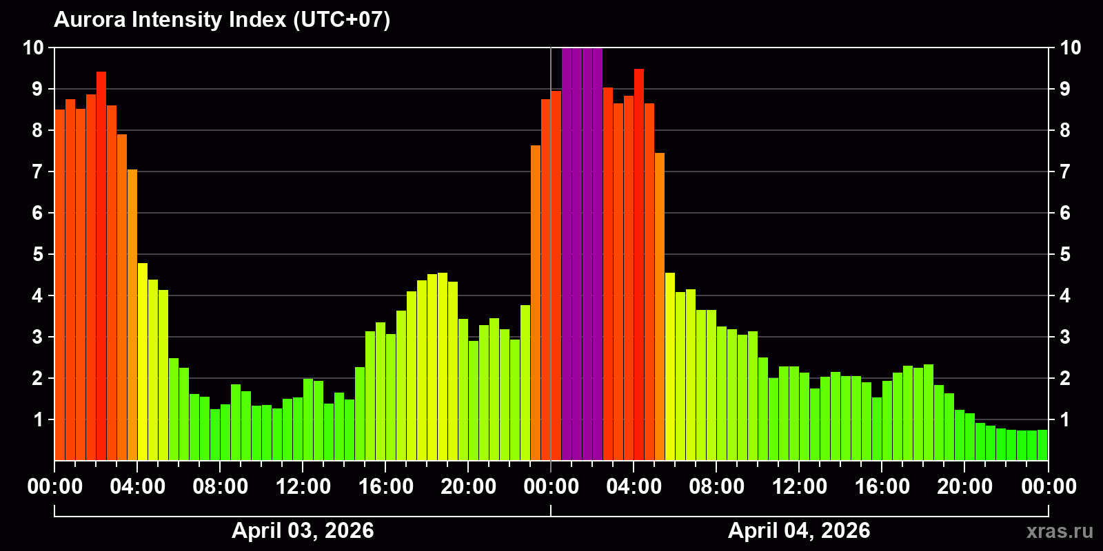 Auroral intensity index and the theoretically possible latitude of observations for nighttime in the Estern Hemisphere as of 2026-04-04 23:59 (end of day) local time
