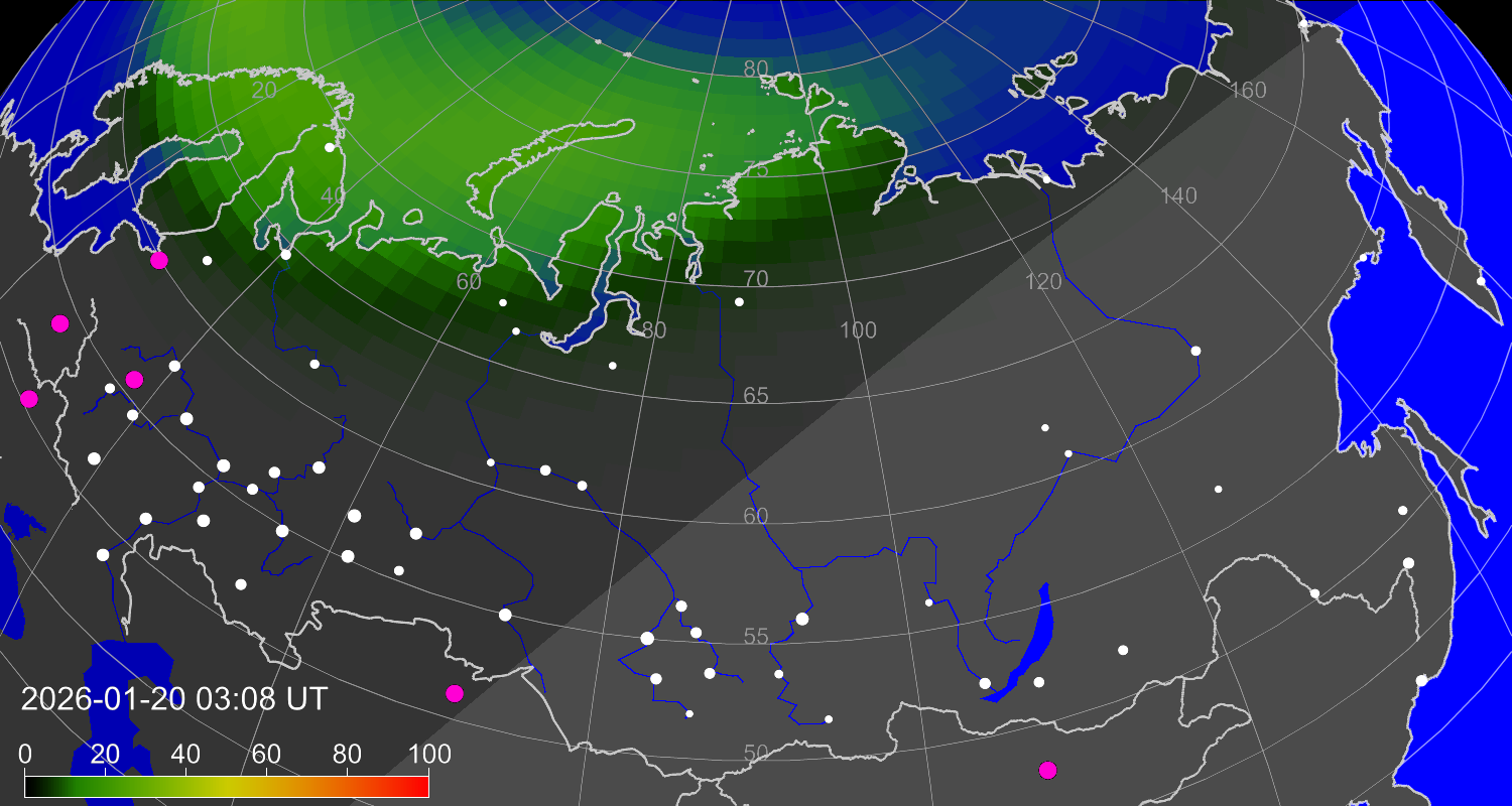 Изменения и часовой прогноз индекса интенсивности полярных сияний с 2026-01-20 по 2026-01-21