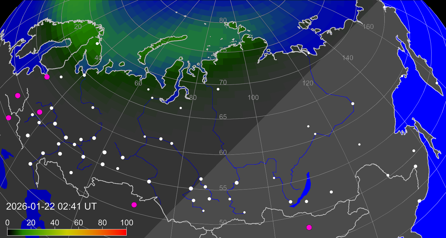 Индекс интенсивности полярных сияний и теоретически возможная широта наблюдений для ночного времени в восточном полушарии