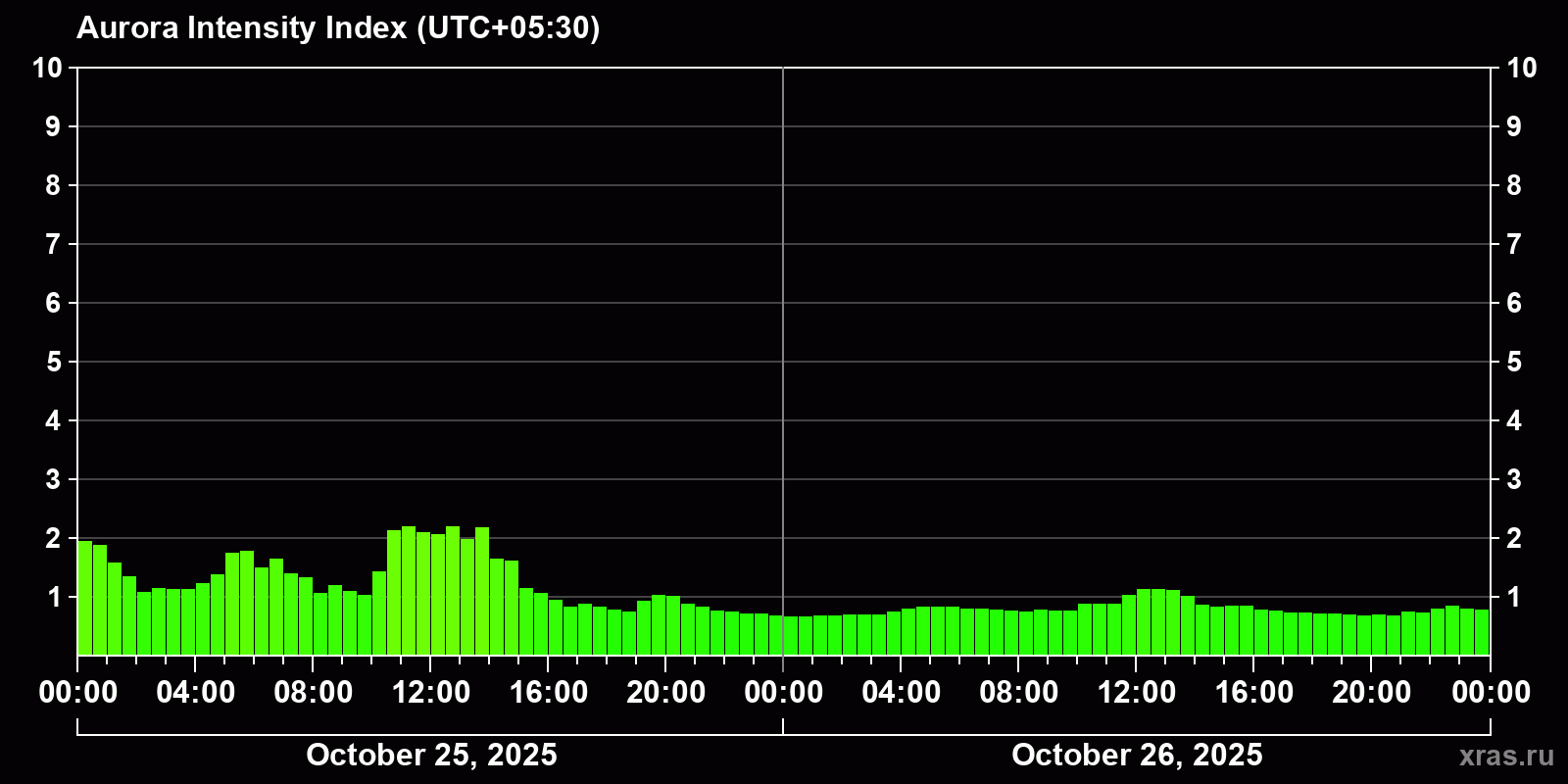 Changes in the auroral intensity index from 2025-10-25 to 2025-10-26 local time