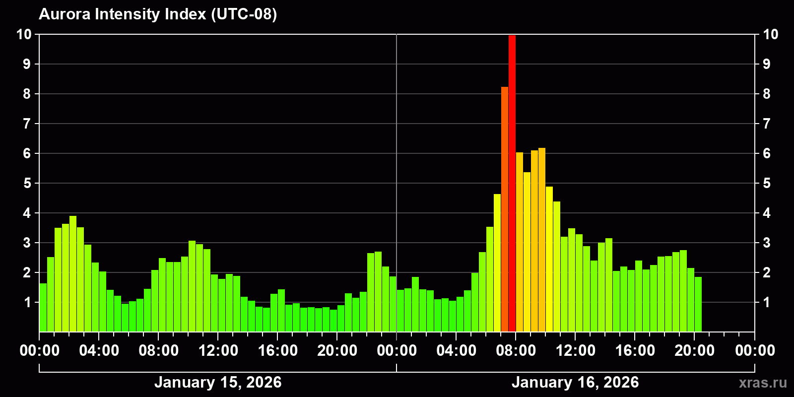 Auroral intensity index and the theoretically possible latitude of observations for nighttime in the Western Hemisphere as of 2026-01-16 18:41 (end of day) local time