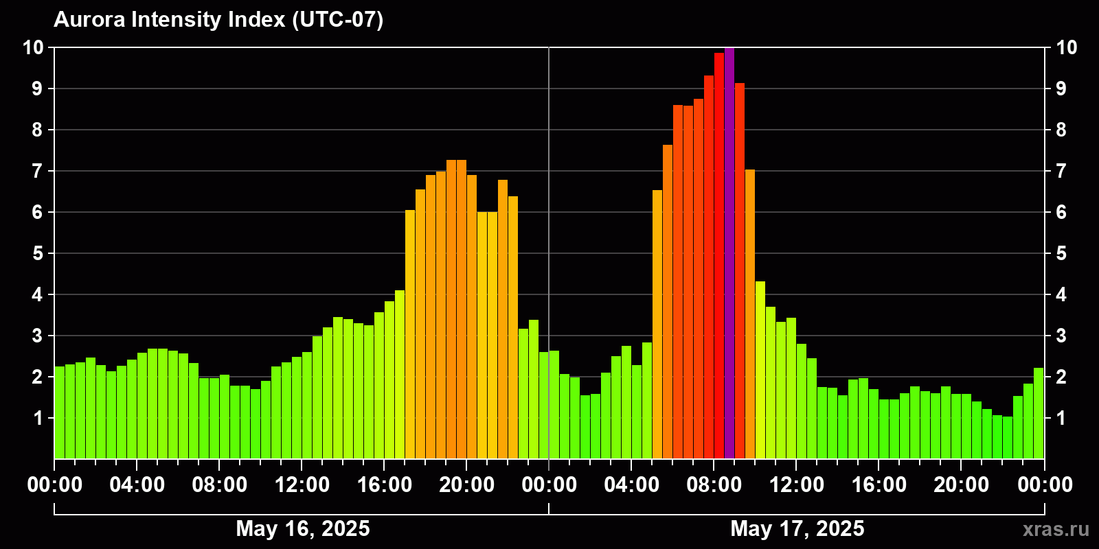 Changes in the auroral intensity index from 2025-05-16 to 2025-05-17 local time