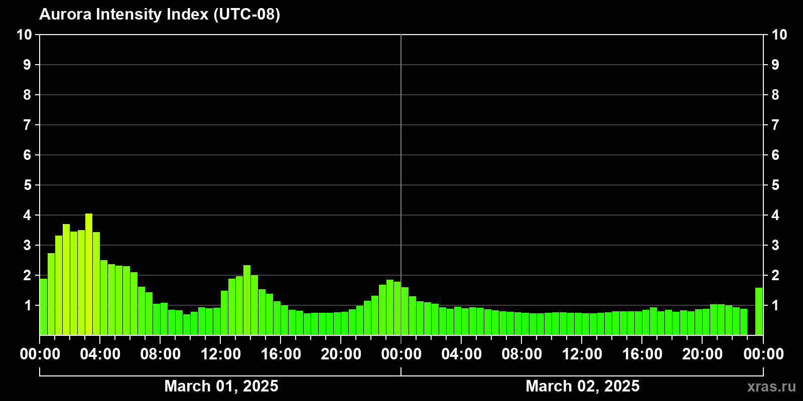 Changes in the auroral intensity index from 2025-03-01 to 2025-03-02 local time