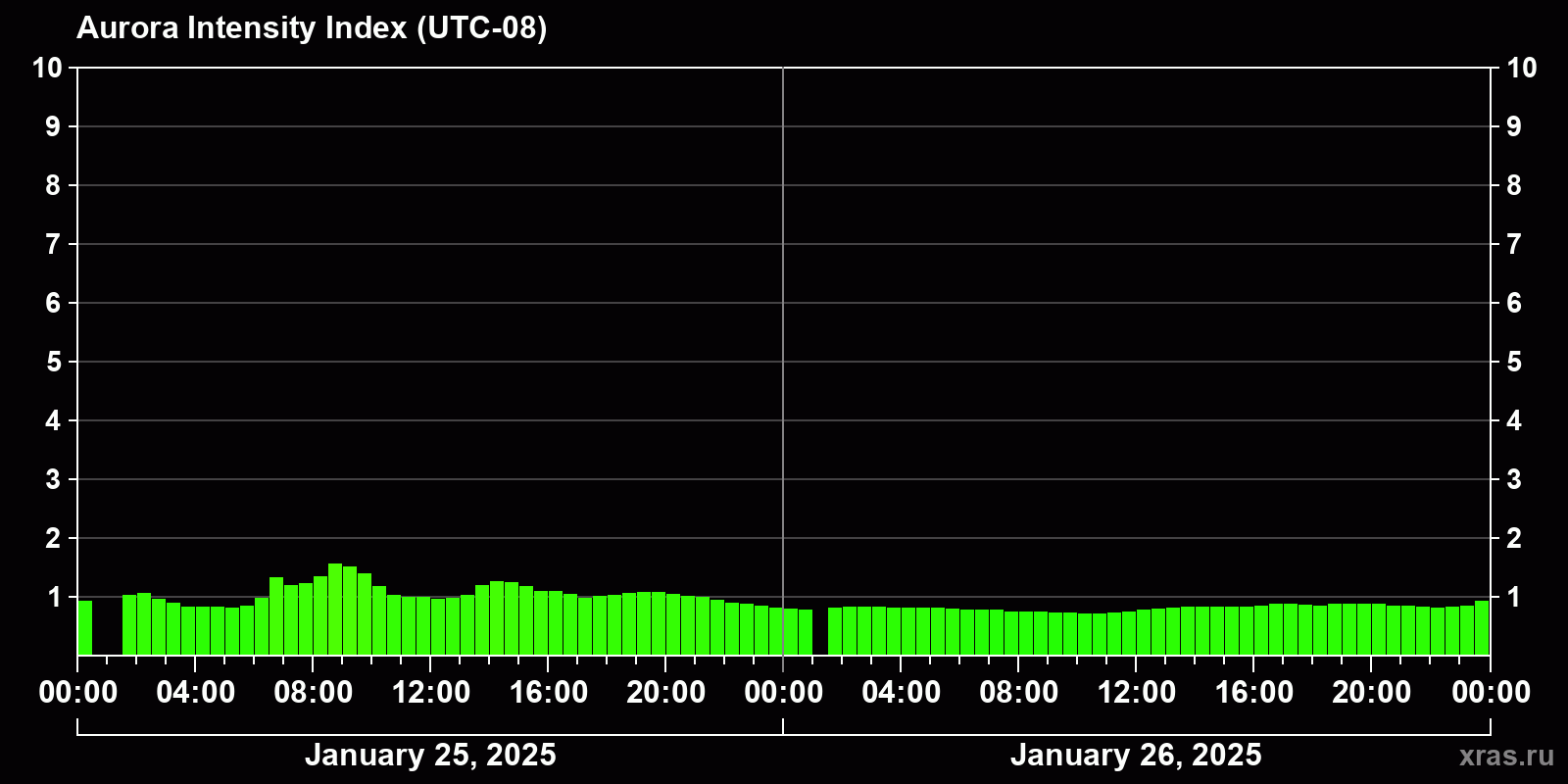 Auroral intensity index and the theoretically possible latitude of observations for nighttime in the Western Hemisphere as of 2025-01-26 23:48 (end of day) local time