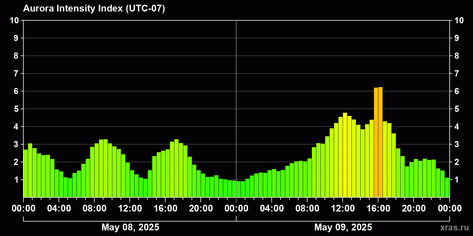 Changes in the auroral intensity index from 2025-05-08 to 2025-05-09 local time