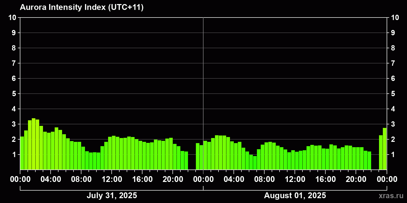Changes in the auroral intensity index from 2025-07-31 to 2025-08-01 local time