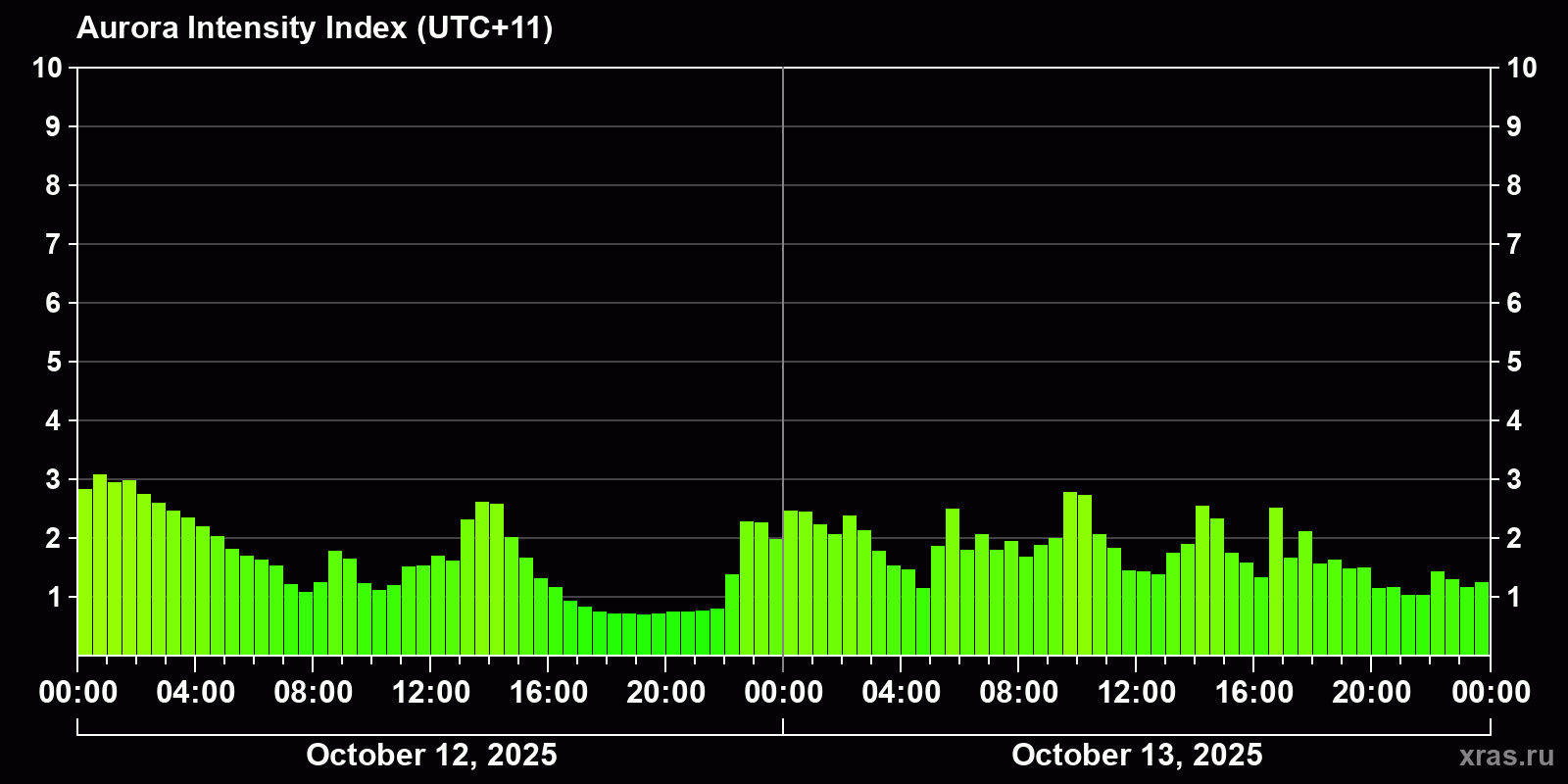 Changes in the auroral intensity index from 2025-10-12 to 2025-10-13 local time