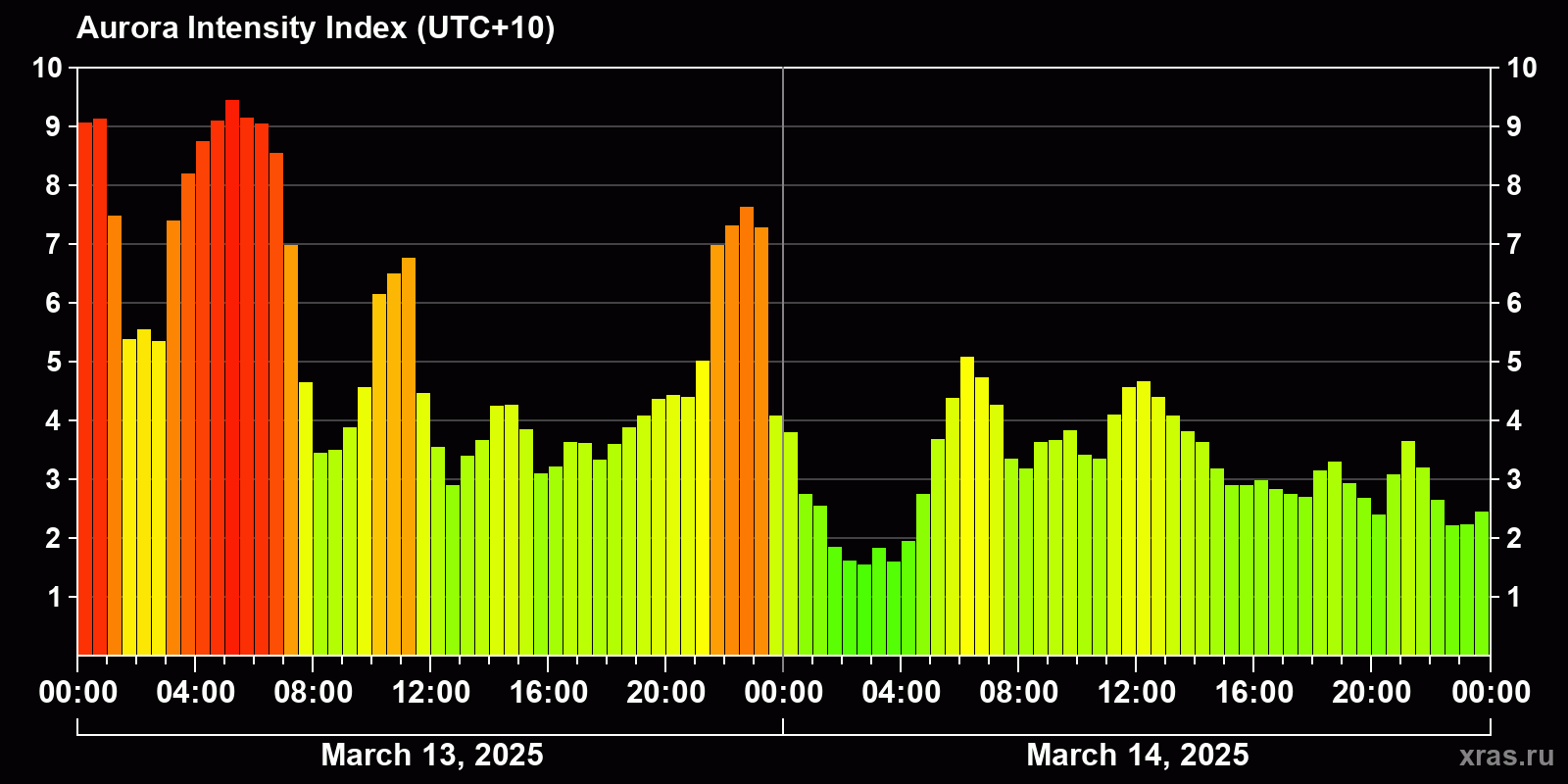 Changes in the auroral intensity index from 2025-03-13 to 2025-03-14 local time