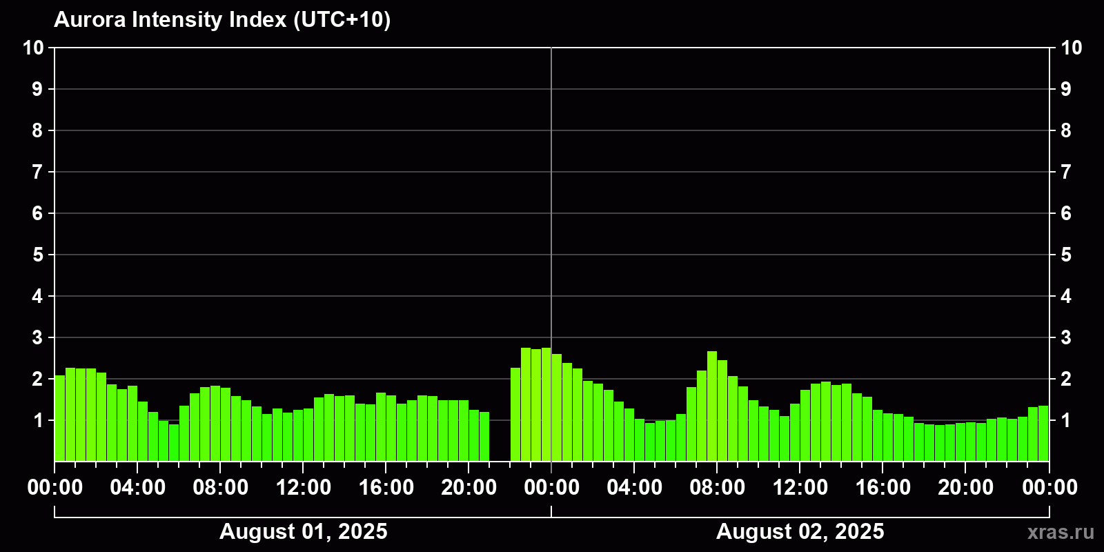 Changes in the auroral intensity index from 2025-08-02 to 2025-08-03 local time