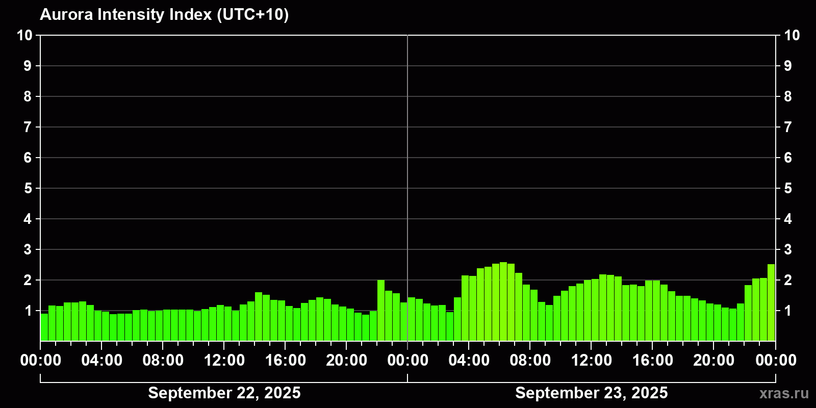 Changes in the auroral intensity index from 2025-09-23 to 2025-09-24 local time