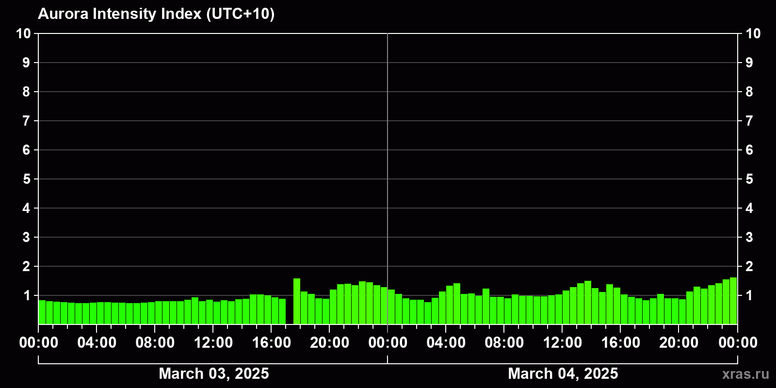 Changes in the auroral intensity index from 2025-03-03 to 2025-03-04 local time