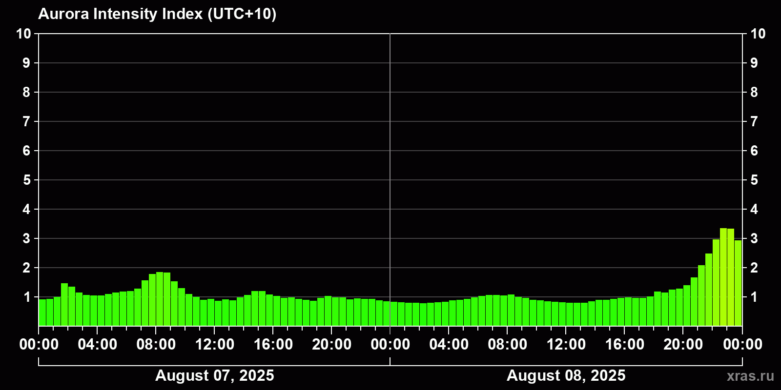 Changes in the auroral intensity index from 2025-08-08 to 2025-08-09 local time