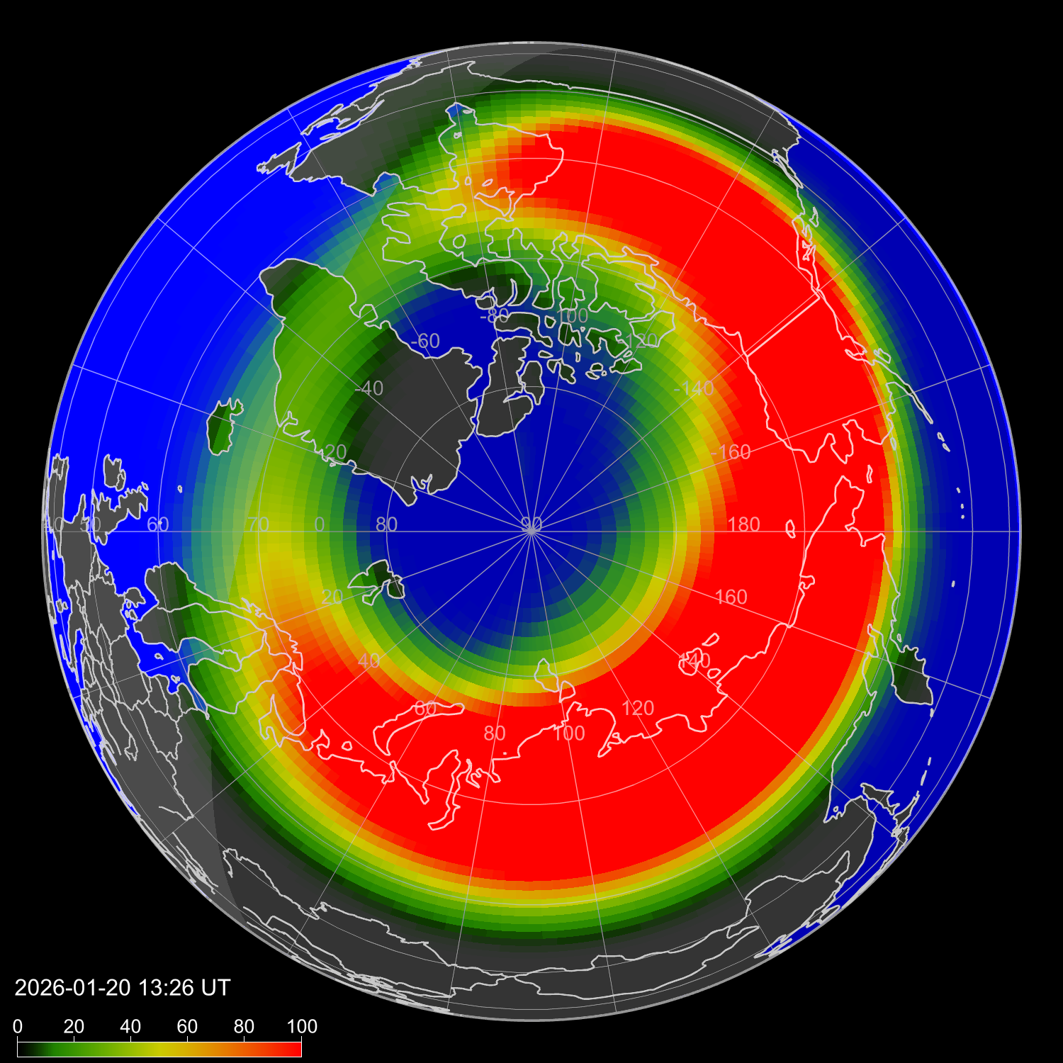 Зона полярных (северных) сияний над территорией Евразии