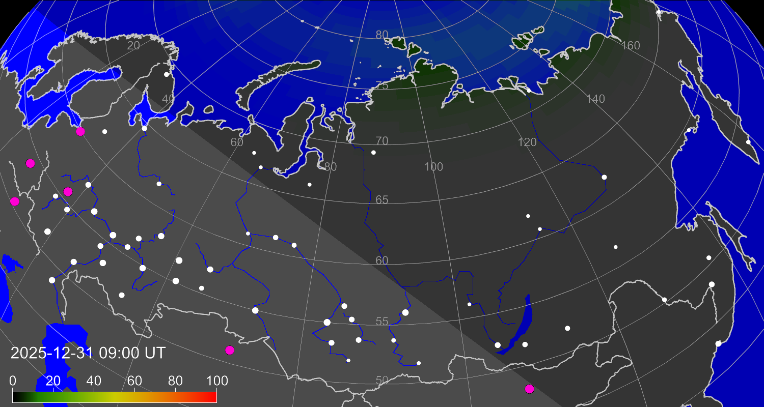 Индекс интенсивности полярных сияний и теоретически возможная широта наблюдений для ночного времени в восточном полушарии