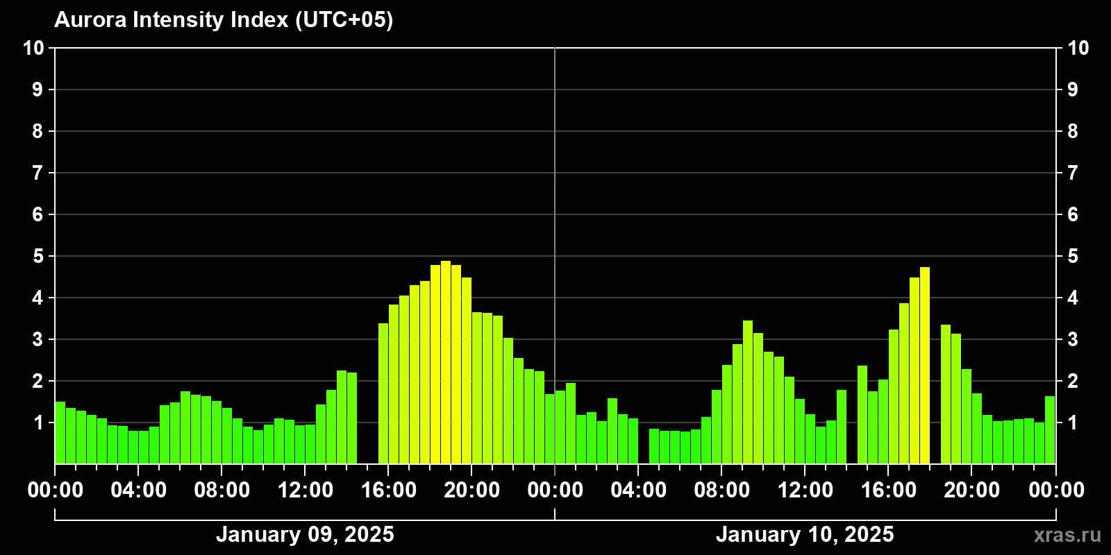 Auroral intensity index and the theoretically possible latitude of observations for nighttime in the Estern Hemisphere as of 2025-01-10 23:47 (end of day) local time