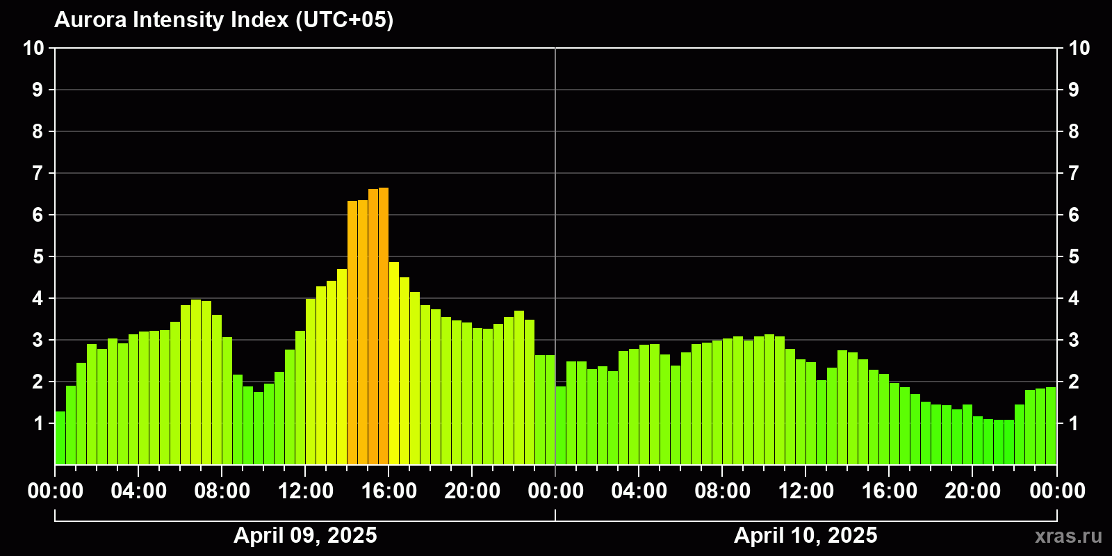 Changes in the auroral intensity index from 2025-04-09 to 2025-04-10 local time