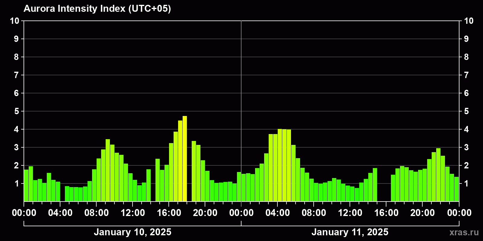 Auroral intensity index and the theoretically possible latitude of observations for nighttime in the Estern Hemisphere as of 2025-01-11 23:47 (end of day) local time