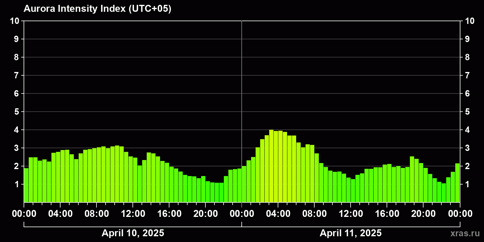 Auroral intensity index and the theoretically possible latitude of observations for nighttime in the Estern Hemisphere as of 2025-04-11 23:49 (end of day) local time