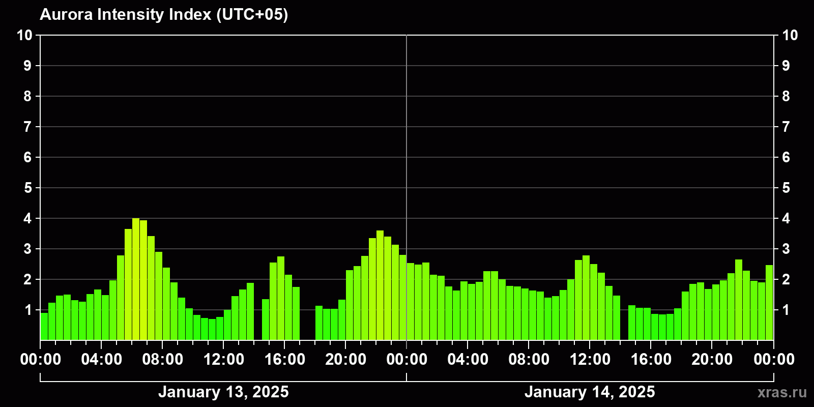 Changes in the auroral intensity index from 2025-01-13 to 2025-01-14 local time
