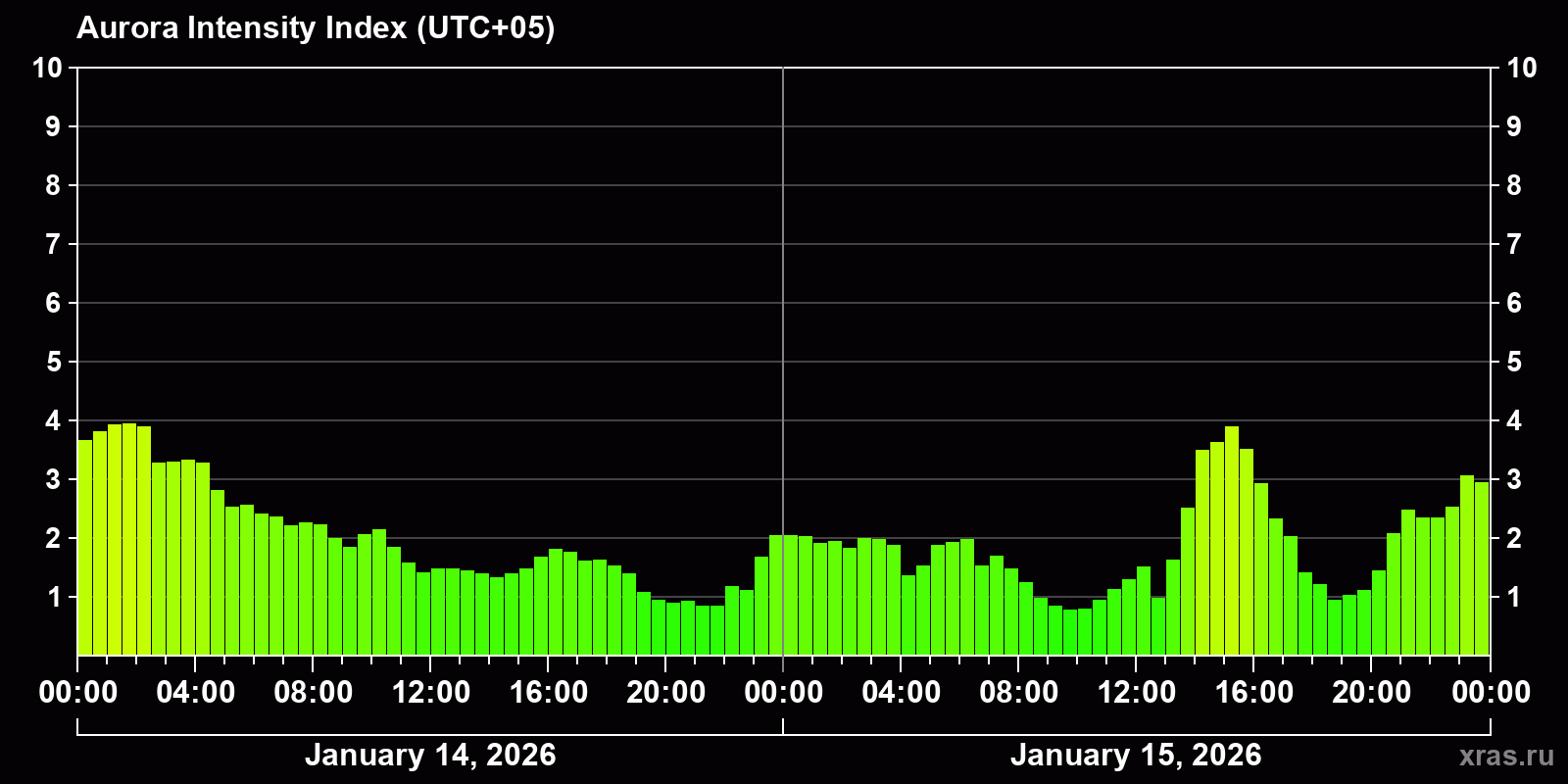 Auroral intensity index and the theoretically possible latitude of observations for nighttime in the Estern Hemisphere as of 2026-01-15 23:56 (end of day) local time