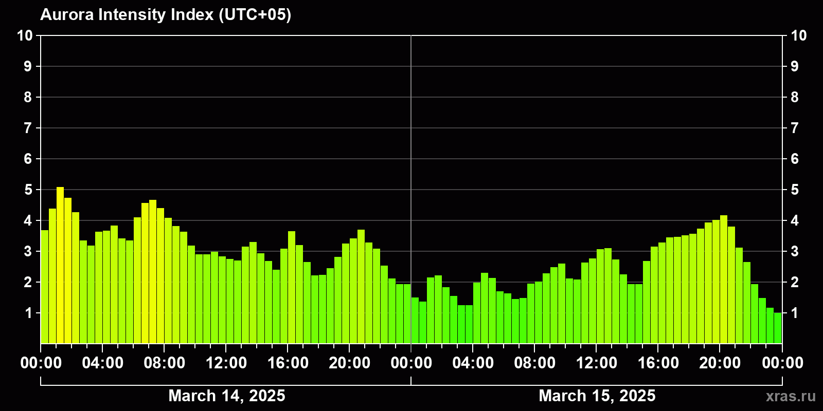 Auroral intensity index and the theoretically possible latitude of observations for nighttime in the Estern Hemisphere as of 2025-03-15 23:51 (end of day) local time