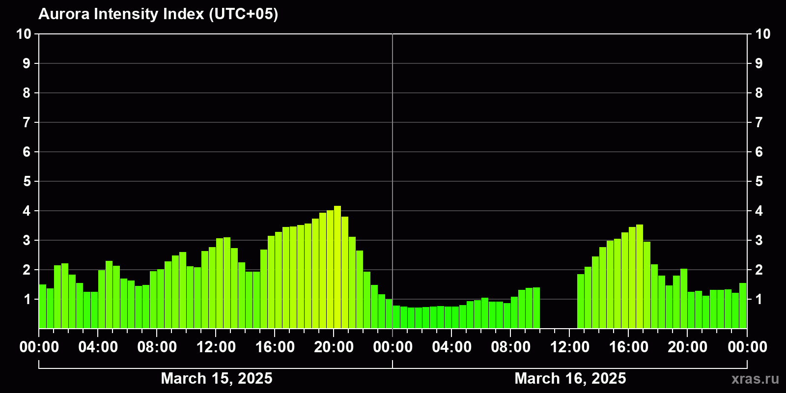 Auroral intensity index and the theoretically possible latitude of observations for nighttime in the Estern Hemisphere as of 2025-03-16 23:48 (end of day) local time