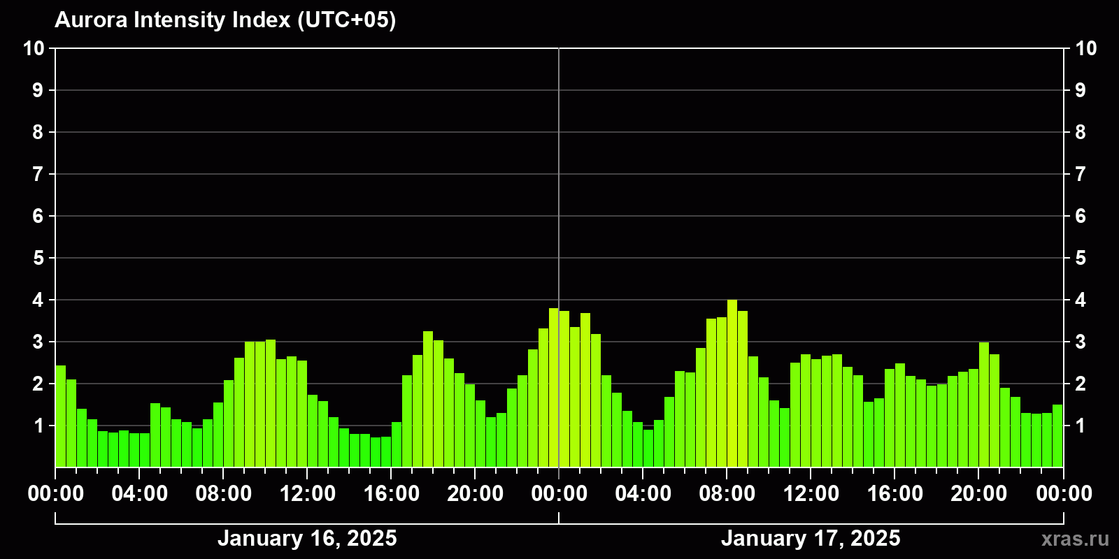 Auroral intensity index and the theoretically possible latitude of observations for nighttime in the Estern Hemisphere as of 2025-01-17 23:49 (end of day) local time