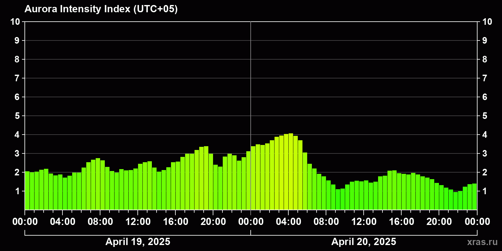 Auroral intensity index and the theoretically possible latitude of observations for nighttime in the Estern Hemisphere as of 2025-04-20 23:54 (end of day) local time