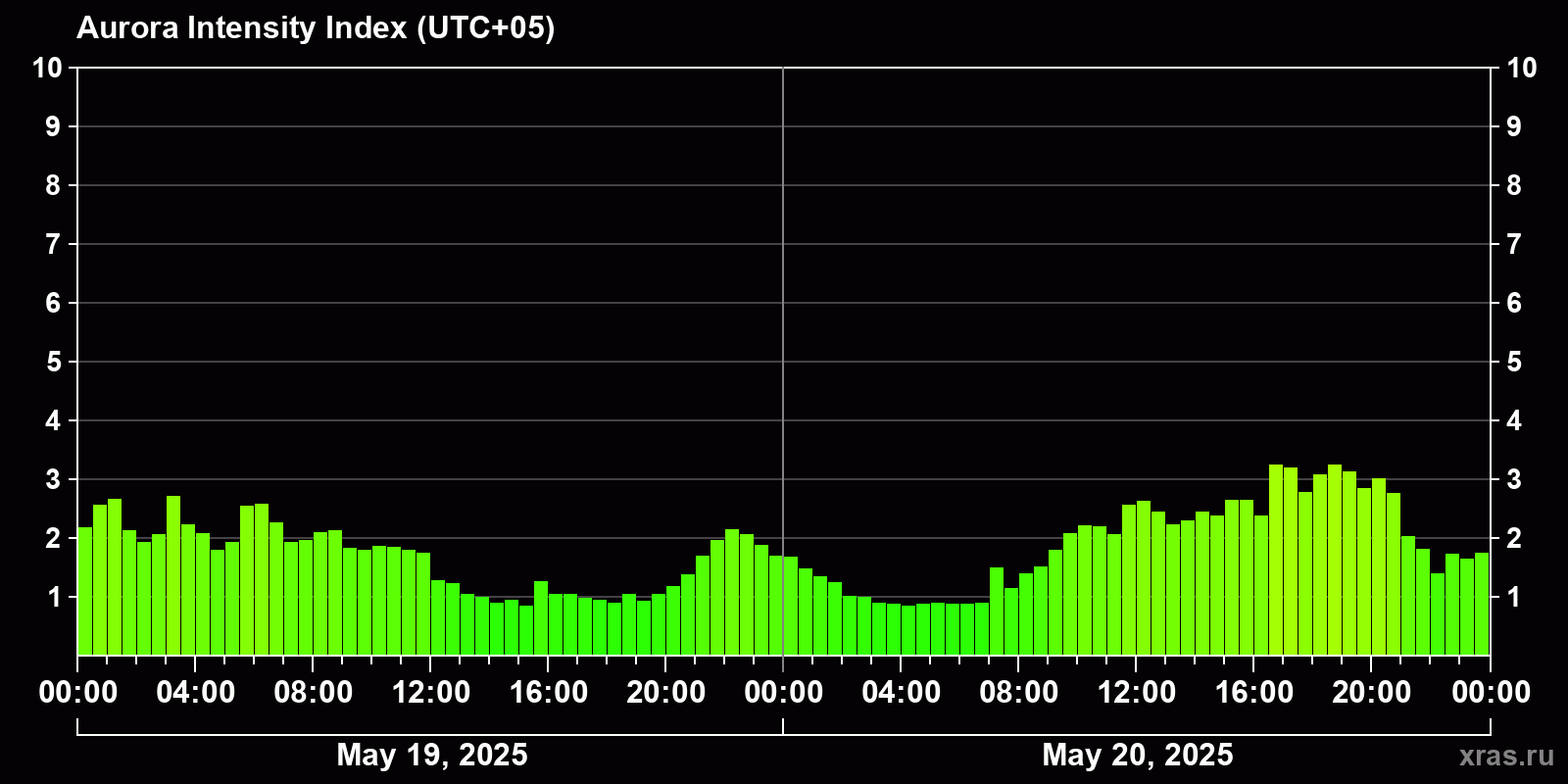 Auroral intensity index and the theoretically possible latitude of observations for nighttime in the Estern Hemisphere as of 2025-05-20 23:55 (end of day) local time