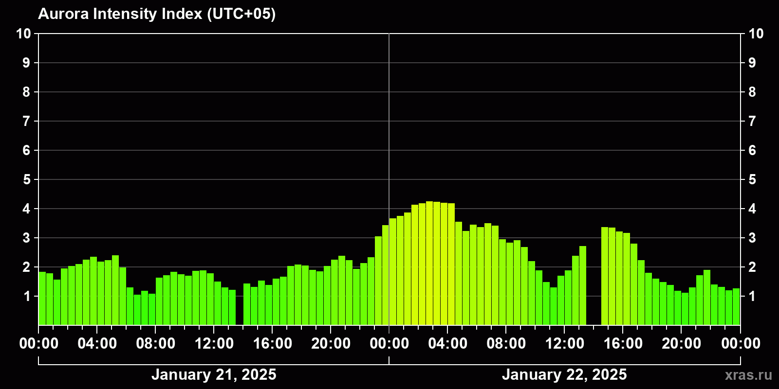 Auroral intensity index and the theoretically possible latitude of observations for nighttime in the Estern Hemisphere as of 2025-01-22 23:34 (end of day) local time