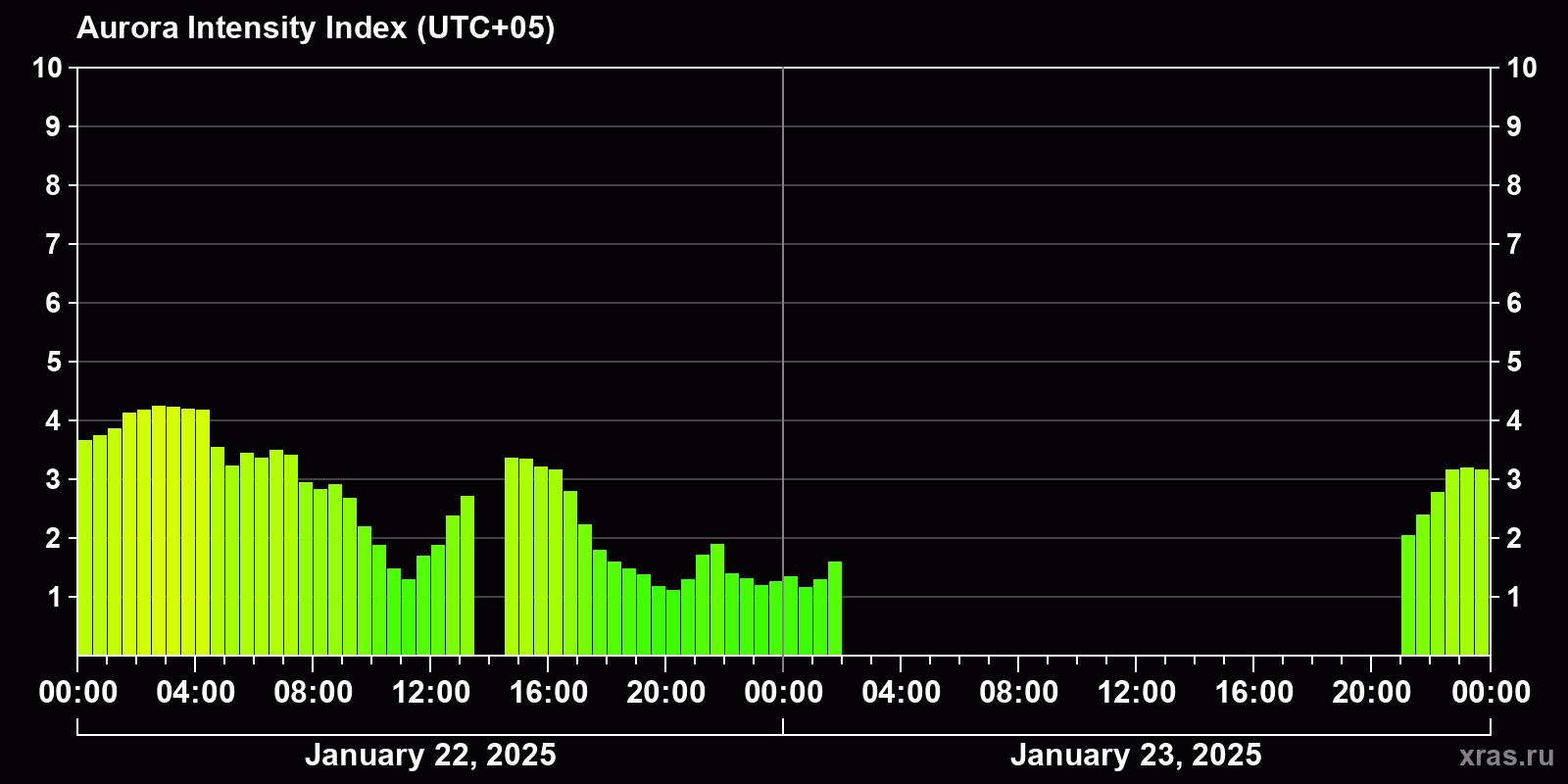 Auroral intensity index and the theoretically possible latitude of observations for nighttime in the Estern Hemisphere as of 2025-01-23 23:52 (end of day) local time