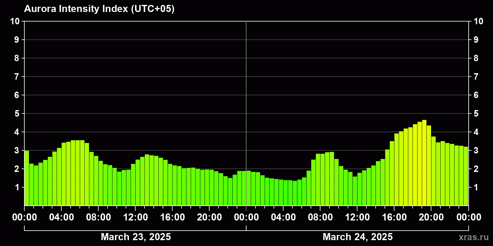 Auroral intensity index and the theoretically possible latitude of observations for nighttime in the Estern Hemisphere as of 2025-03-24 23:45 (end of day) local time