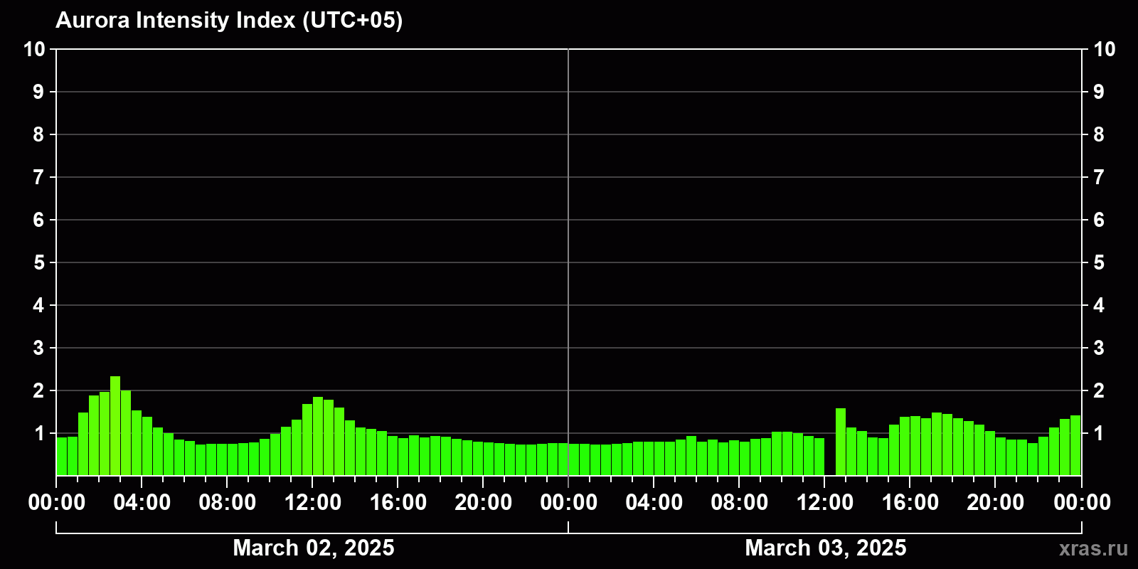Changes in the auroral intensity index from 2025-03-02 to 2025-03-03 local time