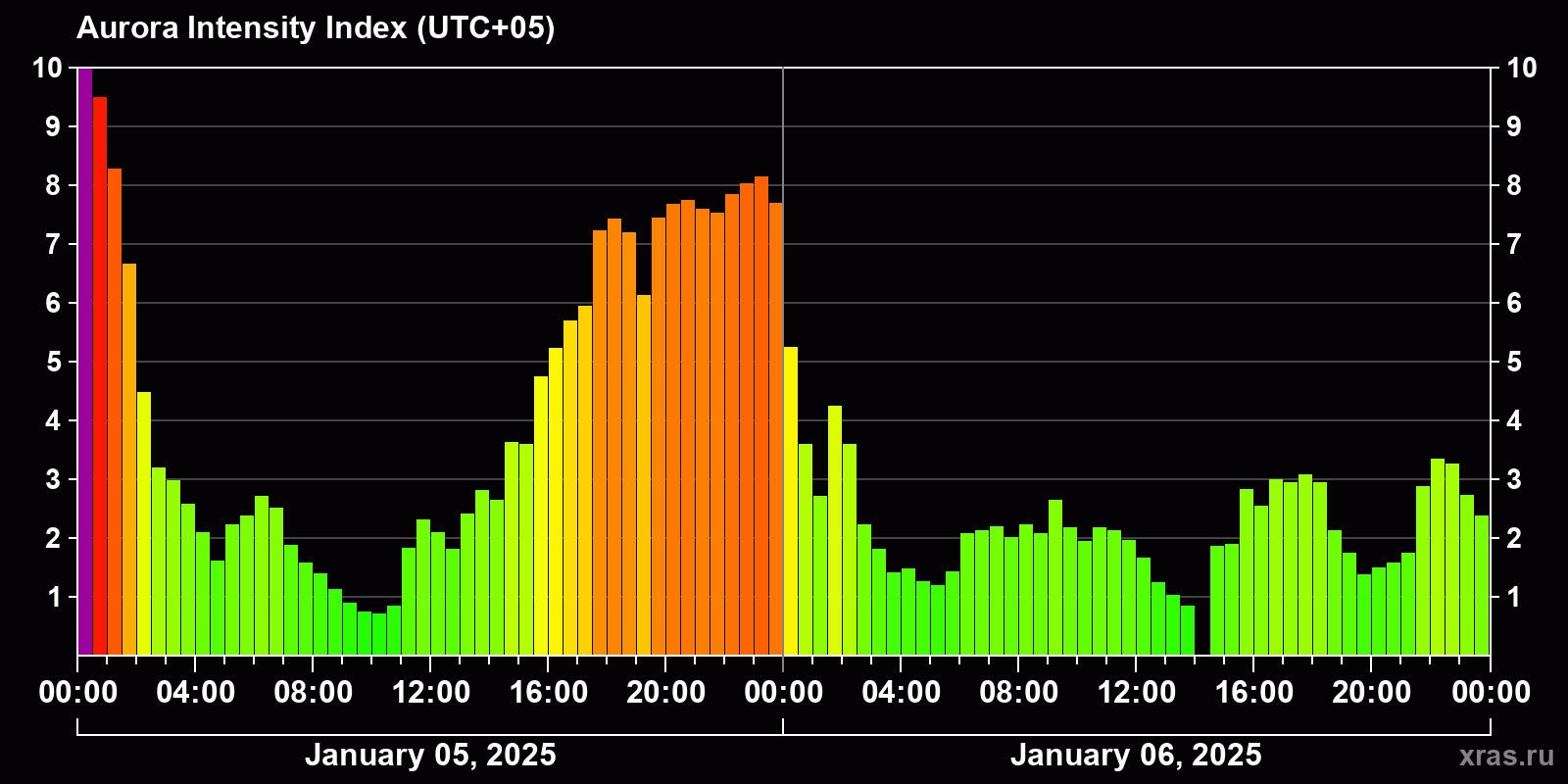 Auroral intensity index and the theoretically possible latitude of observations for nighttime in the Estern Hemisphere as of 2025-01-06 23:50 (end of day) local time