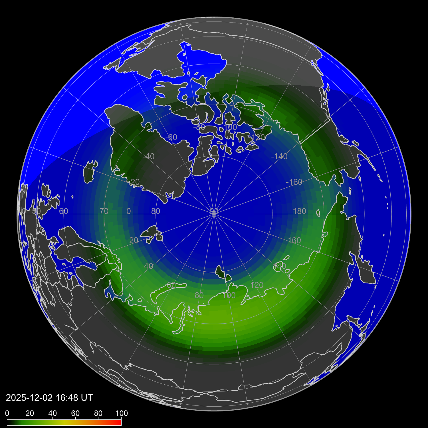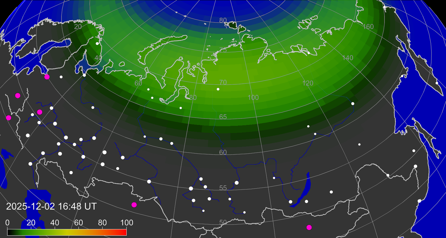 Изменения и часовой прогноз индекса интенсивности полярных сияний с 2025-11-30 по 2025-12-01